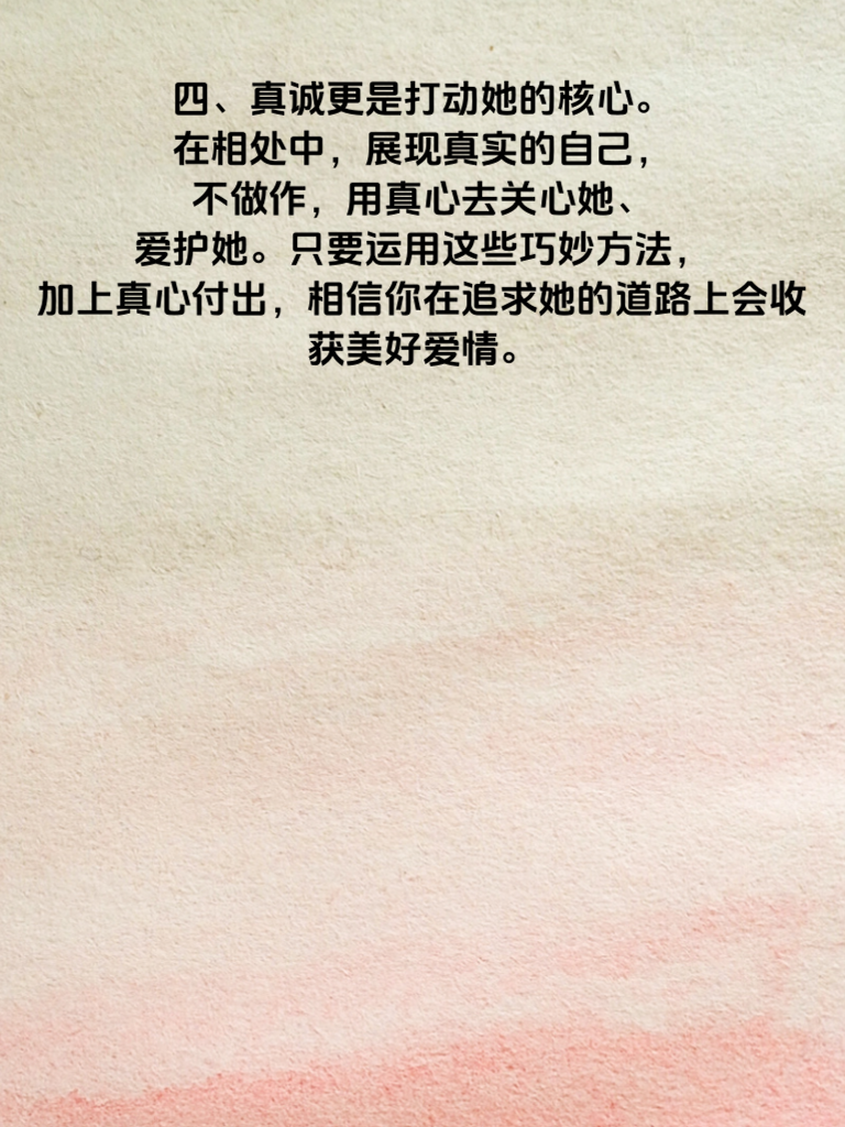 一、恋爱智谋大比拼,追求她的巧妙方法与实例分析,这可是一场充满趣味与挑战的情感较量。在追求心仪女生的道路上,掌握巧妙方法至关重要。 二、比如,了解她的兴趣爱好就是关键一招。若她喜欢阅读,你可以精心挑选几本她可能感兴趣的书籍,约她一起在安静的咖啡馆分享读书心得。就像朋友小李,得知心仪女生爱画画,便报名了绘画班,在学习过程中与她相识,感情逐渐升温。 三、制造惊喜也是屡试不爽的妙招。偷偷为她准备一份小礼物,或是策划一次特别的约会。小王在女生生日时,精心布置了房间,准备了烛光晚餐,让女生感动不已。 四、真诚更是打动她的核心。在相处中,展现真实的自己,不做作,用真心去关心她、爱护她。只要运用这些巧妙方法,加上真心付出,相信你在追求她的道路上会收获美好爱情。