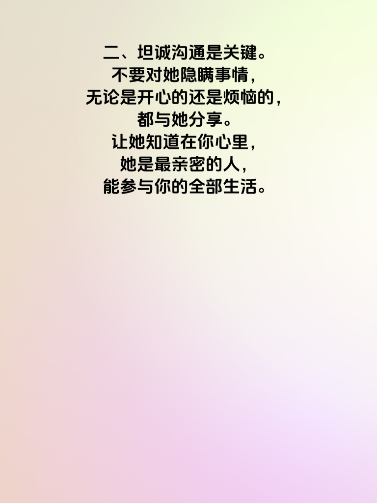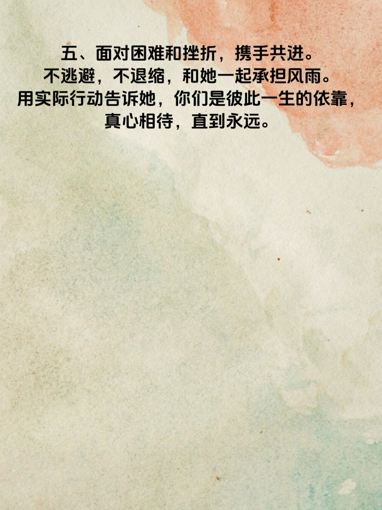 一、真心相待一生,是男人对爱情最庄重的承诺。要践行这个承诺,首先得从日常的点滴关心做起。清晨的一句问候,疲惫时的一个拥抱,都能让她感受到你的在乎。 二、坦诚沟通是关键。不要对她隐瞒事情,无论是开心的还是烦恼的,都与她分享。让她知道在你心里,她是最亲密的人,能参与你的全部生活。 三、尊重她的想法和选择。她的梦想、喜好,都认真对待。支持她去追求自己想要的,而不是试图把她变成你理想中的样子。 四、在行动上始终如一。答应她的事,一定要做到。用日复一日的坚持,证明你对这份感情的认真,让她相信你会一直陪伴在她身边。 五、面对困难和挫折,携手共进。不逃避,不退缩,和她一起承担风雨。用实际行动告诉她,你们是彼此一生的依靠,真心相待,直到永远。