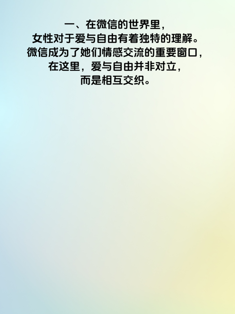 一、在微信的世界里,女性对于爱与自由有着独特的理解。微信成为了她们情感交流的重要窗口,在这里,爱与自由并非对立,而是相互交织。 二、对于女性而言,爱意味着真诚的关心与尊重。一句简单的早安问候,分享生活中的点滴趣事,都能传递爱的温度。但同时,她们也渴望自由,不希望爱成为束缚。比如,她们希望在忙碌时有自己的空间去处理工作,而不是时刻被要求报备行踪。 三、男生追求女生时,要懂得把握这个平衡。在微信交流中,适度表达关心,不要过于急切。给她足够的自由去做自己喜欢的事,当她分享喜悦时,真诚地给予回应;当她需要安静时,默默陪伴。 四、例如,她发了一张自己精心制作的美食照片,不要只是简单夸赞,还可以询问制作过程中的趣事,让她感受到你对她生活的兴趣。这样,在微信的爱与自由之间,你们能建立起更美好的情感纽带。