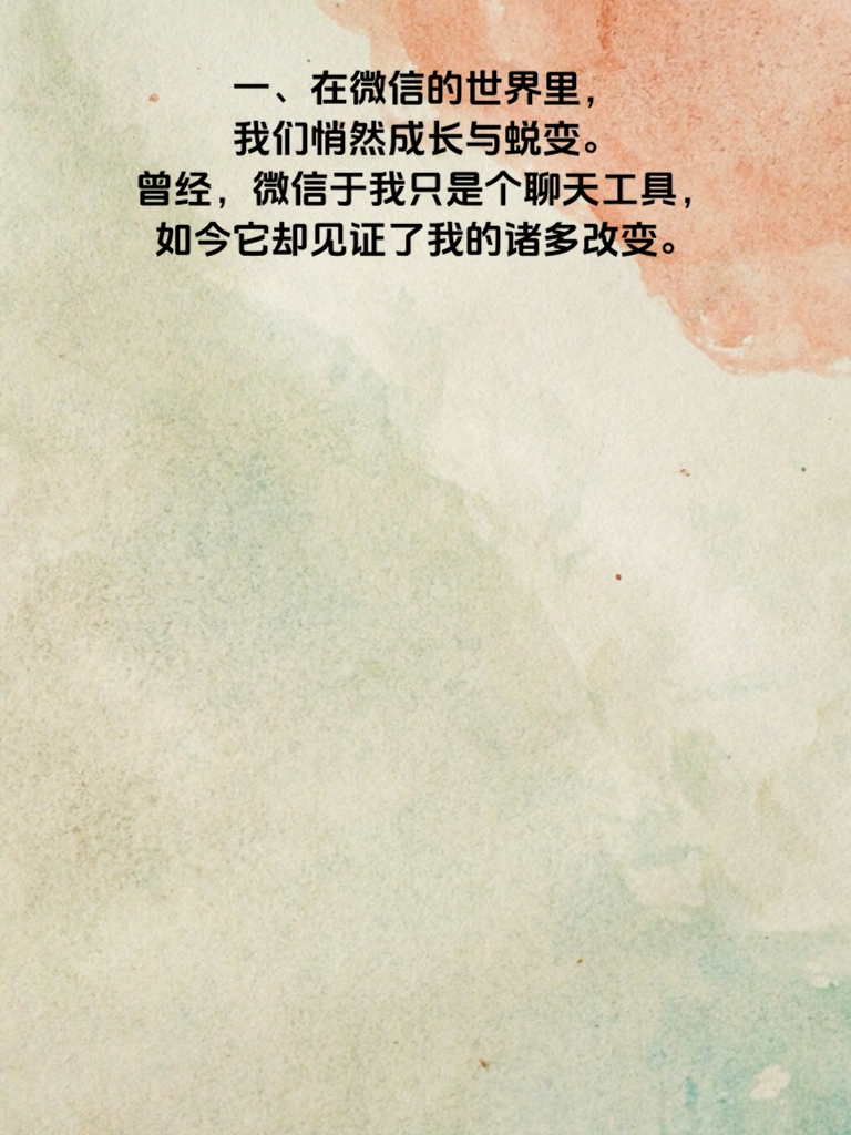 一、在微信的世界里,我们悄然成长与蜕变。曾经,微信于我只是个聊天工具,如今它却见证了我的诸多改变。 二、通过微信,我学会了更清晰地表达自己。不再是模糊不清的言辞,而是能精准地说出内心所想。比如,以前面对喜欢的人,会含蓄躲闪,现在能大方真诚地分享日常。 三、它让我懂得了倾听的重要。认真去看对方的每一条消息,用心去理解话语背后的情感。不再急于表达,而是先感受对方的情绪。 四、微信也成了我审视自我的镜子。回顾自己发过的朋友圈、聊天记录,能发现自己的进步与不足。比如曾经爱抱怨,现在学会了积极面对生活,展现出更阳光的一面。 五、在与他人的交流互动中,我实现了蜕变。从小心翼翼到自信从容,能更好地处理各种关系。微信,成了我情感成长路上的得力伙伴,陪伴我不断遇见更好的自己。