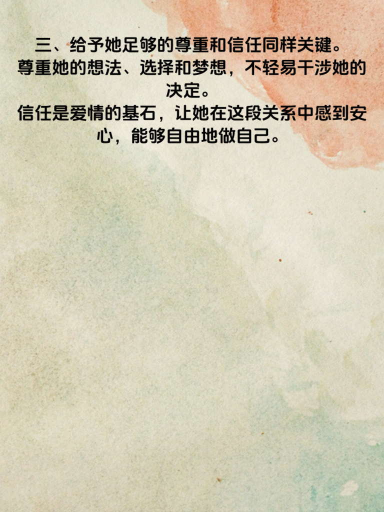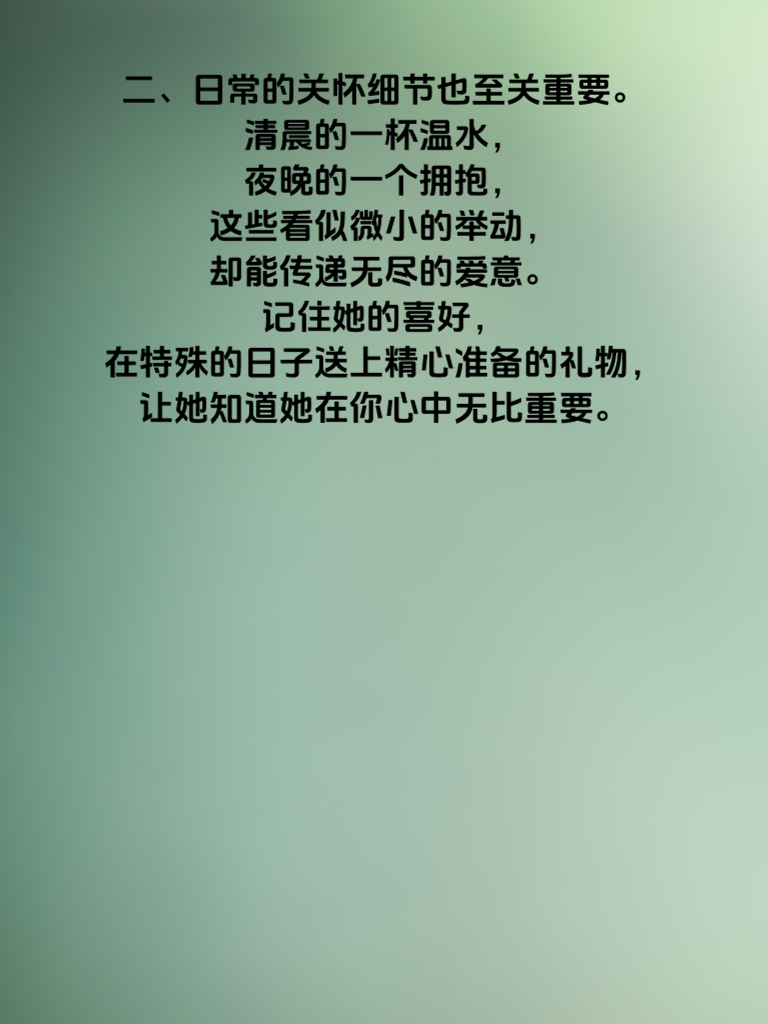一、在爱情的旅程中,男人若想让爱情成为生活温暖的港湾,真心守护是首要秘诀。真心意味着坦诚相待,不藏着掖着,让对方感受到你最真实的一面。无论是快乐还是烦恼,都与她分享,让她成为你生活中不可或缺的一部分。 二、日常的关怀细节也至关重要。清晨的一杯温水,夜晚的一个拥抱,这些看似微小的举动,却能传递无尽的爱意。记住她的喜好,在特殊的日子送上精心准备的礼物,让她知道她在你心中无比重要。 三、给予她足够的尊重和信任同样关键。尊重她的想法、选择和梦想,不轻易干涉她的决定。信任是爱情的基石,让她在这段关系中感到安心,能够自由地做自己。 四、面对生活的风风雨雨,男人要坚定地站在她身边,成为她的依靠。共同面对困难,一起解决问题,在相互扶持中让爱情愈发坚固。当爱情成为生活的港湾,你们将携手走过美好的一生。