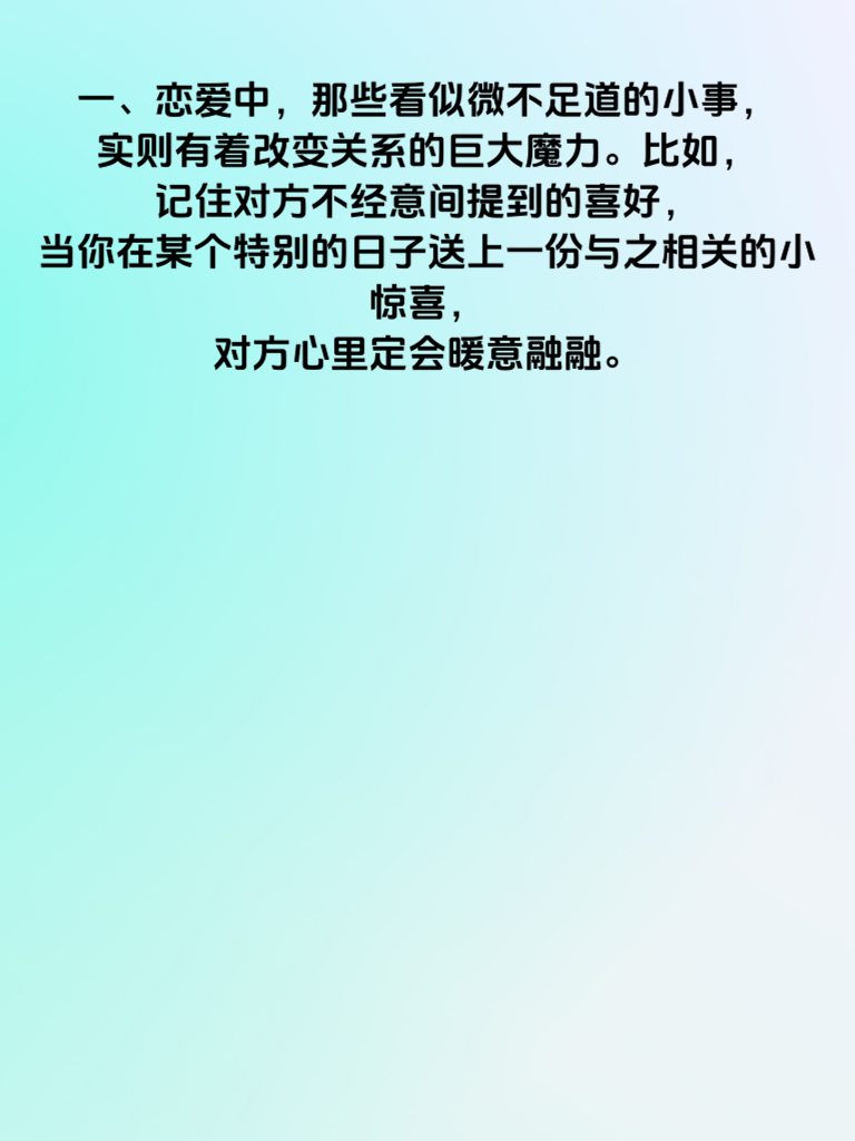 一、恋爱中,那些看似微不足道的小事,实则有着改变关系的巨大魔力。比如,记住对方不经意间提到的喜好,当你在某个特别的日子送上一份与之相关的小惊喜,对方心里定会暖意融融。 二、日常相处时,一个温柔的眼神、一个贴心的拥抱,都能传递无尽的爱意。在对方疲惫时,默默递上一杯热茶,无需言语,这份关怀便已足够。 三、一起经历生活的点滴,分享每一个开心或难过的瞬间。当对方遇到困难,坚定地站在她身边,给予支持和鼓励。这些小事,会像丝丝春雨,滋润着你们的爱情,让对方越来越爱你。