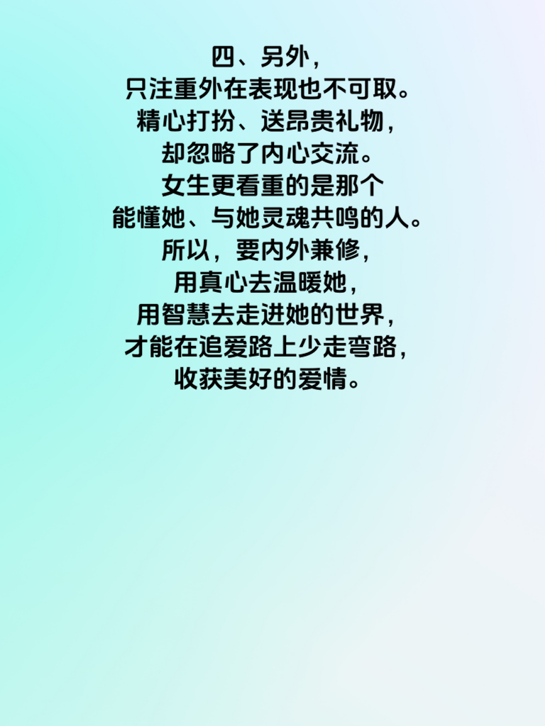 一、追爱之路,布满迷雾,稍有不慎就会踏入误区。很多男生在追求女生时,常犯一些错误,让自己的真心被误解,感情之路坎坷崎岖。 二、其中一个常见误区是过度纠缠。频繁地给女生发消息,不分场合地打电话,以为这样能表达自己的热情,实则会给女生带来压力。爱不是压迫,而是适度的空间与尊重。比如,一天发太多消息,会让女生觉得喘不过气,甚至产生厌烦。 三、还有急于表白。在彼此还不够了解,感情基础不深厚时就贸然表白,往往会吓到女生。感情需要循序渐进,先建立良好的沟通与互动,让她感受到你的真诚与魅力,再水到渠成地表白,成功几率才更大。 四、另外,只注重外在表现也不可取。精心打扮、送昂贵礼物,却忽略了内心交流。女生更看重的是那个能懂她、与她灵魂共鸣的人。所以,要内外兼修,用真心去温暖她,用智慧去走进她的世界,才能在追爱路上少走弯路,收获美好的爱情。