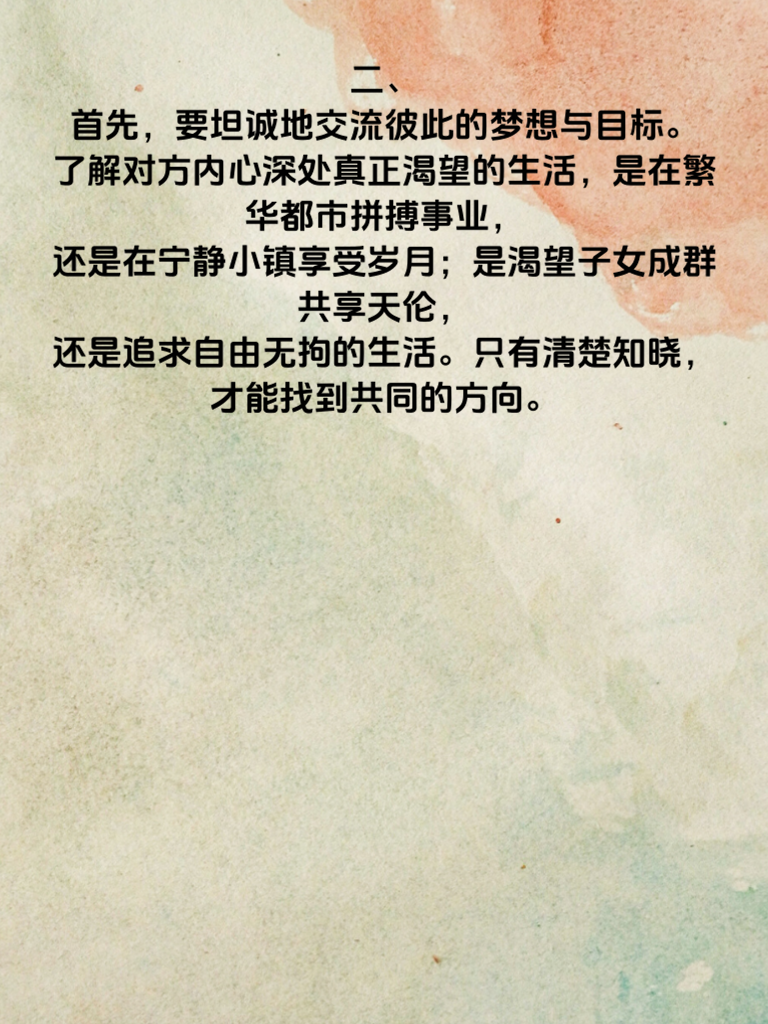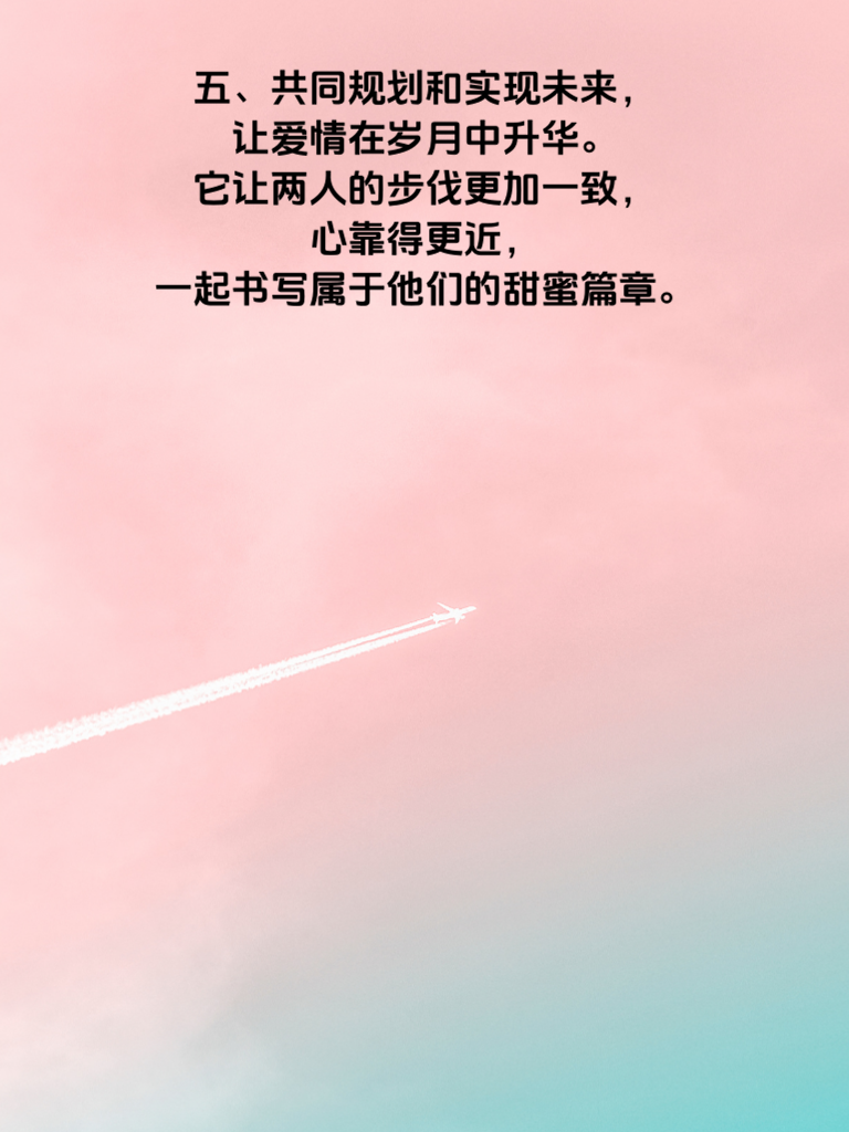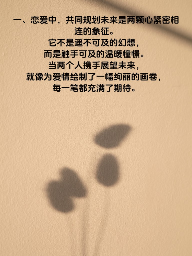 一、恋爱中,共同规划未来是两颗心紧密相连的象征。它不是遥不可及的幻想,而是触手可及的温暖憧憬。当两个人携手展望未来,就像为爱情绘制了一幅绚丽的画卷,每一笔都充满了期待。 二、首先,要坦诚地交流彼此的梦想与目标。了解对方内心深处真正渴望的生活,是在繁华都市拼搏事业,还是在宁静小镇享受岁月;是渴望子女成群共享天伦,还是追求自由无拘的生活。只有清楚知晓,才能找到共同的方向。 三、接着,依据共同目标制定切实可行的计划。比如,若都向往旅行,那就规划每年一起去一个心仪之地;若想拥有温馨小窝,就计划何时开始攒钱、如何挑选地段等。 四、在实现未来规划的路上,难免会有风雨。此时需相互扶持,鼓励对方勇敢面对困难。每一次挫折都是成长的契机,共同跨越,未来才会更加坚实。 五、共同规划和实现未来,让爱情在岁月中升华。它让两人的步伐更加一致,心靠得更近,一起书写属于他们的甜蜜篇章。