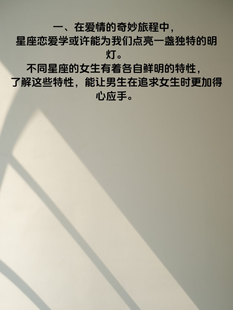 一、在爱情的奇妙旅程中,星座恋爱学或许能为我们点亮一盏独特的明灯。不同星座的女生有着各自鲜明的特性,了解这些特性,能让男生在追求女生时更加得心应手。 二、比如白羊座女生热情直爽,她们喜欢简单直接的相处方式。追求她们时,不妨大胆地表达自己的心意,陪她们一起去冒险,共同体验生活的激情。 三、而巨蟹座女生温柔细腻,渴望安全感。男生要多关心她们的生活点滴,在她们需要依靠时,及时给予温暖的怀抱和坚定的支持。 四、天秤座女生注重平衡与美感,追求她们要展现出自己优雅的一面,尊重她们的每一个决定,和她们一起营造美好的生活氛围。 五、通过星座特性去谈恋爱,并非是刻板的遵循,而是一种有趣的探索。它能让我们更好地理解彼此,在爱情中少走弯路,收获更加甜蜜美好的爱情。