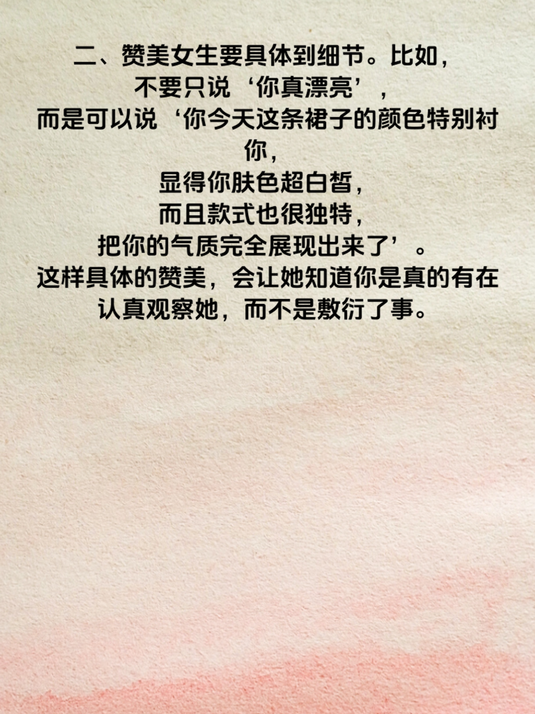 一、在追求女生的过程中,巧妙地赞美是打开她心扉的一把金钥匙。真诚且恰到好处的赞美,能让女生感受到你的欣赏与关注,迅速拉近你们之间的距离。 二、赞美女生要具体到细节。比如,不要只说‘你真漂亮’,而是可以说‘你今天这条裙子的颜色特别衬你,显得你肤色超白皙,而且款式也很独特,把你的气质完全展现出来了’。这样具体的赞美,会让她知道你是真的有在认真观察她,而不是敷衍了事。 三、从她的兴趣爱好入手赞美也很有效。如果她喜欢画画,你可以说‘我看了你画的那幅风景画,色彩搭配得太妙了,每一处笔触都好像有生命一样,能感觉到你在其中投入了很多情感’。这会让她觉得你尊重并重视她所热爱的事物。 四、赞美她的内在品质同样重要。像‘我发现你特别有耐心,上次帮朋友解决问题的时候,有条不紊地分析,还一直安慰对方,真的很温暖’。这种对她内在美的肯定,会让她更深刻地记住你。总之,学会巧妙赞美,让爱情之路更加顺畅。