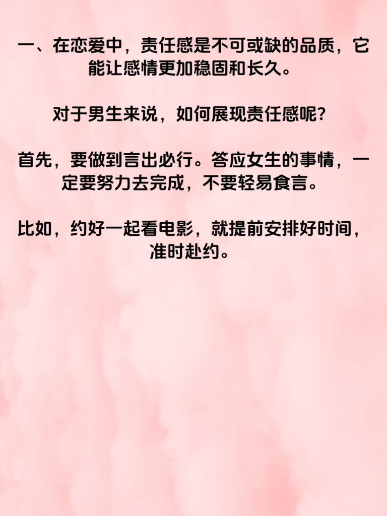 一、在恋爱中,责任感是不可或缺的品质,它能让感情更加稳固和长久。对于男生来说,如何展现责任感呢?首先,要做到言出必行。答应女生的事情,一定要努力去完成,不要轻易食言。比如,约好一起看电影,就提前安排好时间,准时赴约。 二、关心女生的生活和情绪也是展现责任感的重要方面。主动询问她一天的经历,在她遇到困难时给予支持和鼓励。当她生病时,细心照顾,让她感受到你的在乎。 三、对未来有规划并且愿意和她一起努力。和她探讨你们的理想生活,一起为实现目标而奋斗。让她知道你是一个有上进心,愿意为了你们的感情付出努力的人。 四、在处理问题时,要有担当。不逃避矛盾,积极沟通解决。遇到分歧时,冷静倾听她的想法,然后坦诚地表达自己的观点,共同寻找最佳解决方案。通过这些方面,男生能很好地在恋爱中展现出责任感,赢得女生的心。