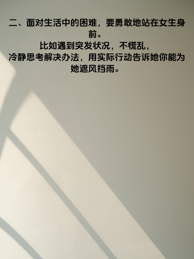 一、在恋爱中,男生展现担当和勇气至关重要。这不仅能给女生带来安全感,更是感情稳定发展的基石。 二、面对生活中的困难,要勇敢地站在女生身前。比如遇到突发状况,不慌乱,冷静思考解决办法,用实际行动告诉她你能为她遮风挡雨。 三、做决定时要有主见和勇气。当两人面临选择,别怕犯错,果断给出自己的想法和判断,让她看到你的果断。 四、敢于坦诚自己的内心。对她真诚表达爱意、歉意以及未来规划,不藏着掖着,展现真实且有担当的自己。 五、在争吵中,有担当的男生会先低头。不是因为怕输,而是珍惜这段感情,用勇气化解矛盾,让爱情之路更加顺畅。