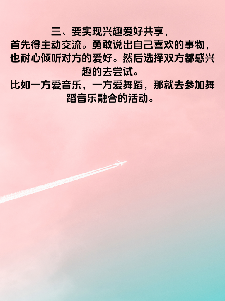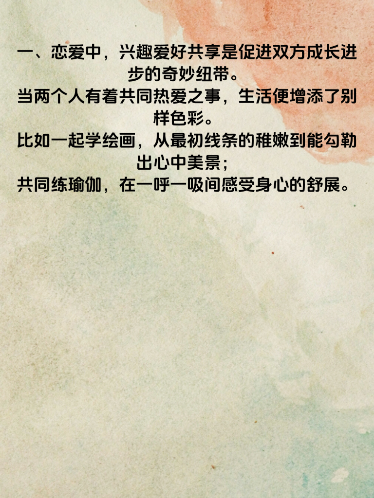一、恋爱中,兴趣爱好共享是促进双方成长进步的奇妙纽带。当两个人有着共同热爱之事,生活便增添了别样色彩。比如一起学绘画,从最初线条的稚嫩到能勾勒出心中美景;共同练瑜伽,在一呼一吸间感受身心的舒展。 二、共享兴趣爱好能加深彼此了解。在共同参与的过程中,看到对方专注投入的模样,发现那些平时未曾展现的闪光点。一起爬山时,能见识到Ta坚韧不拔的毅力;一起做手工时,领略Ta细腻独特的心思。 三、要实现兴趣爱好共享,首先得主动交流。勇敢说出自己喜欢的事物,也耐心倾听对方的爱好。然后选择双方都感兴趣的去尝试。比如一方爱音乐,一方爱舞蹈,那就去参加舞蹈音乐融合的活动。 四、共享兴趣爱好时,互相鼓励与支持至关重要。当对方遇到困难想放弃,一个温暖的眼神、一句坚定的加油,都能给予继续前行的力量。如此,在恋爱中通过兴趣爱好共享,双方不断成长进步,感情也愈发深厚。