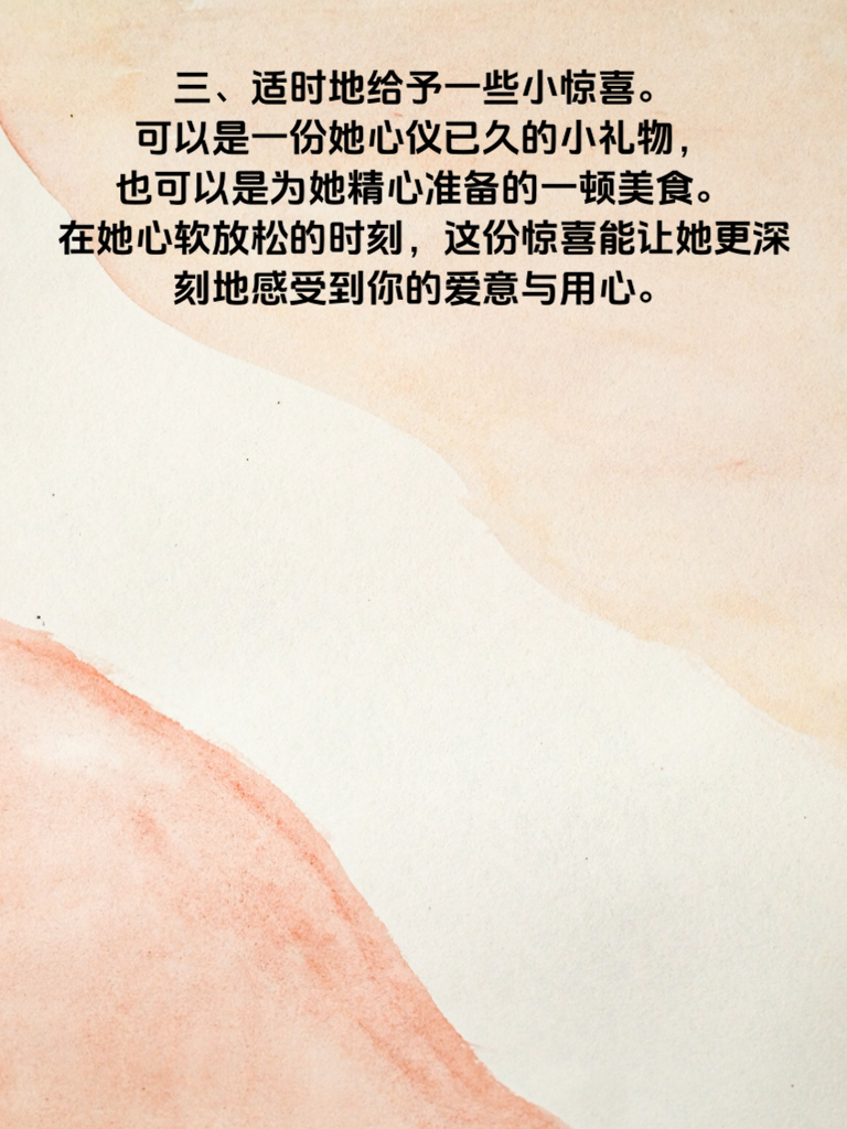 一、女生心软时,是感情升温的绝佳时机。这时男生若能把握好,往往能让彼此的关系更上一层楼。首先,要给予她充分的理解与倾听。当她因某事而心软,情绪有所波动时,耐心地听她倾诉,不要急于打断或评判。 二、用温柔且真诚的话语安慰她。轻声细语地表达你对她的心疼,让她感受到你是真正在乎她内心的感受。比如,轻轻抱住她说:‘别难过,我在这儿呢,不管怎样我都会陪着你。’ 三、适时地给予一些小惊喜。可以是一份她心仪已久的小礼物,也可以是为她精心准备的一顿美食。在她心软放松的时刻,这份惊喜能让她更深刻地感受到你的爱意与用心。 四、陪她做一些能让她开心的事。比如看一场浪漫的电影,去她喜欢的地方散步。在这个过程中,全身心地投入,让她沉浸在愉悦的氛围里,从而进一步拉近你们之间的距离。
