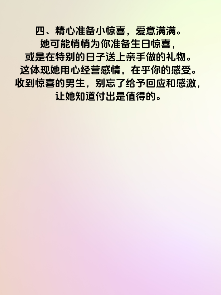 一、女生恋爱时,不经意间的温柔浅笑,格外心动。那笑容如春日暖阳,驱散阴霾。比如在两人相处时,男生分享生活趣事,她嘴角微微上扬,眼中满是笑意,这瞬间能让男生心里泛起涟漪。所以男生们要留意这温柔笑容,它可是女生爱意的无声表达。 二、专注倾听男生讲话时,女生超迷人。她会停下手中事,眼神专注地看着你,认真听你倾诉喜怒哀乐。像你讲工作烦恼,她静静聆听,适时给予安慰和建议,让你感到被重视。这表明她把你的事放在心上,遇到这样的女生要好好珍惜。 三、偶尔的小依赖很是可爱。比如一起走路时,她轻轻挽住你的手臂,或是遇到困难下意识地向你求助。这种小依赖说明她信任你,把你当作依靠。男生这时要展现出担当,给她足够的安全感。 四、精心准备小惊喜,爱意满满。她可能悄悄为你准备生日惊喜,或是在特别的日子送上亲手做的礼物。这体现她用心经营感情,在乎你的感受。收到惊喜的男生,别忘了给予回应和感激,让她知道付出是值得的。 五、在朋友面前大方夸赞你,超有面子。她会毫不吝啬地向朋友炫耀你的优点,比如你的才华、善良等。这说明她以你为傲,内心认可你们的感情。男生也要同样支持她,让这份感情在相互欣赏中升温。