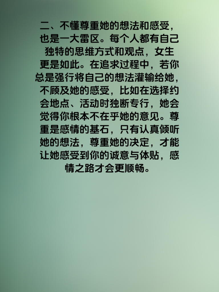 一、追求女生时,千万别踏入过度纠缠的雷区。有些男生一旦对某个女生心动,就恨不得时刻黏在她身边,消息秒回,电话秒接,甚至频繁出现在她工作或生活的场所。可这种过度的纠缠,只会给女生带来巨大的压力。她会觉得自己的私人空间被严重侵犯,对你的好感也会在这种压迫感中逐渐消磨。所以,保持适当的距离,给彼此一些自由呼吸的空间,才是明智之举。 二、不懂尊重她的想法和感受也是一大雷区。每个人都有自己独特的思维方式和观点,女生更是如此。在追求过程中,若你总是强行将自己的想法灌输给她,不顾及她的感受,比如在选择约会地点、活动时独断专行,她会觉得你根本不在乎她的意见。尊重是感情的基石,只有认真倾听她的想法,尊重她的决定,才能让她感受到你的诚意与体贴,感情之路才会更顺畅。 三、过度炫耀自身条件同样不可取。有的男生为了吸引女生注意,会不停地炫耀自己的财富、地位或成就。然而,真正的感情并非建立在物质和虚荣之上。这种炫耀会让女生觉得你很虚荣、浮躁,甚至怀疑你接近她的动机不纯。真诚才是打动人心的法宝,用你的真心和实际行动去关心她、爱护她,远比空洞的炫耀更能赢得她的芳心。