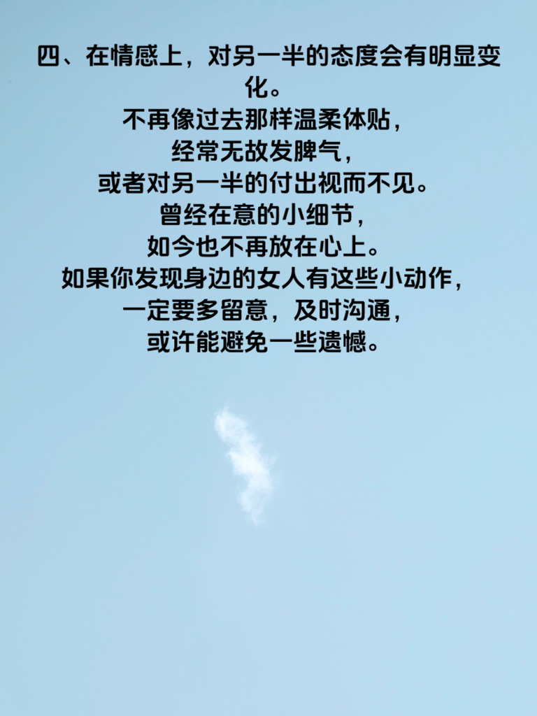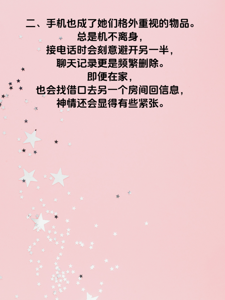 一、女人出轨前,往往会有一些不易察觉的小动作。首先,她们在打扮上会变得格外用心。以前可能素面朝天,现在却突然开始注重妆容,每天花费大量时间精心打扮自己,试图以全新的形象出现在他人面前。 二、手机也成了她们格外重视的物品。总是机不离身,接电话时会刻意避开另一半,聊天记录更是频繁删除。即便在家,也会找借口去另一个房间回信息,神情还会显得有些紧张。 三、对家庭的态度也悄然改变。开始频繁抱怨家务繁琐,对家人的关心减少,不再像以前那样积极参与家庭活动。甚至会找各种理由晚归,对另一半的询问也变得不耐烦。 四、在情感上,对另一半的态度会有明显变化。不再像过去那样温柔体贴,经常无故发脾气,或者对另一半的付出视而不见。曾经在意的小细节,如今也不再放在心上。如果你发现身边的女人有这些小动作,一定要多留意,及时沟通,或许能避免一些遗憾。