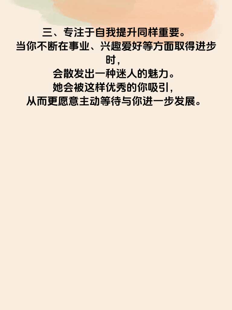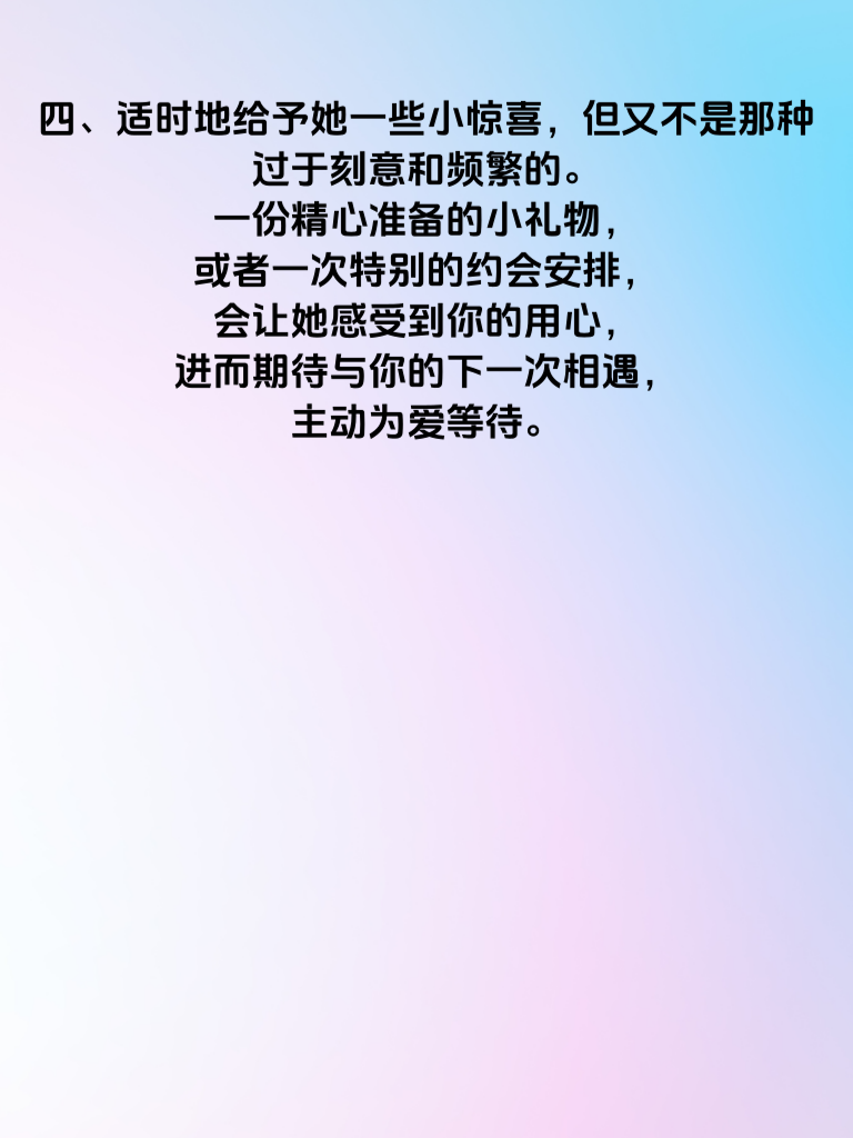 一、在追求女生的过程中,有一种独特的心计能让她主动为爱等待。首先,要展现出自身的神秘感。不要一股脑地把自己所有的事情都和盘托出,偶尔保留一些小秘密,引发她的好奇心。 二、保持适当的距离也很关键。不要天天围着她转,给彼此一些独立的空间去做自己喜欢的事。这样她会更珍惜和你相处的时光,也会主动思考你们之间的关系。 三、专注于自我提升同样重要。当你不断在事业、兴趣爱好等方面取得进步时,会散发出一种迷人的魅力。她会被这样优秀的你吸引,从而更愿意主动等待与你进一步发展。 四、适时地给予她一些小惊喜,但又不是那种过于刻意和频繁的。一份精心准备的小礼物,或者一次特别的约会安排,会让她感受到你的用心,进而期待与你的下一次相遇,主动为爱等待。
