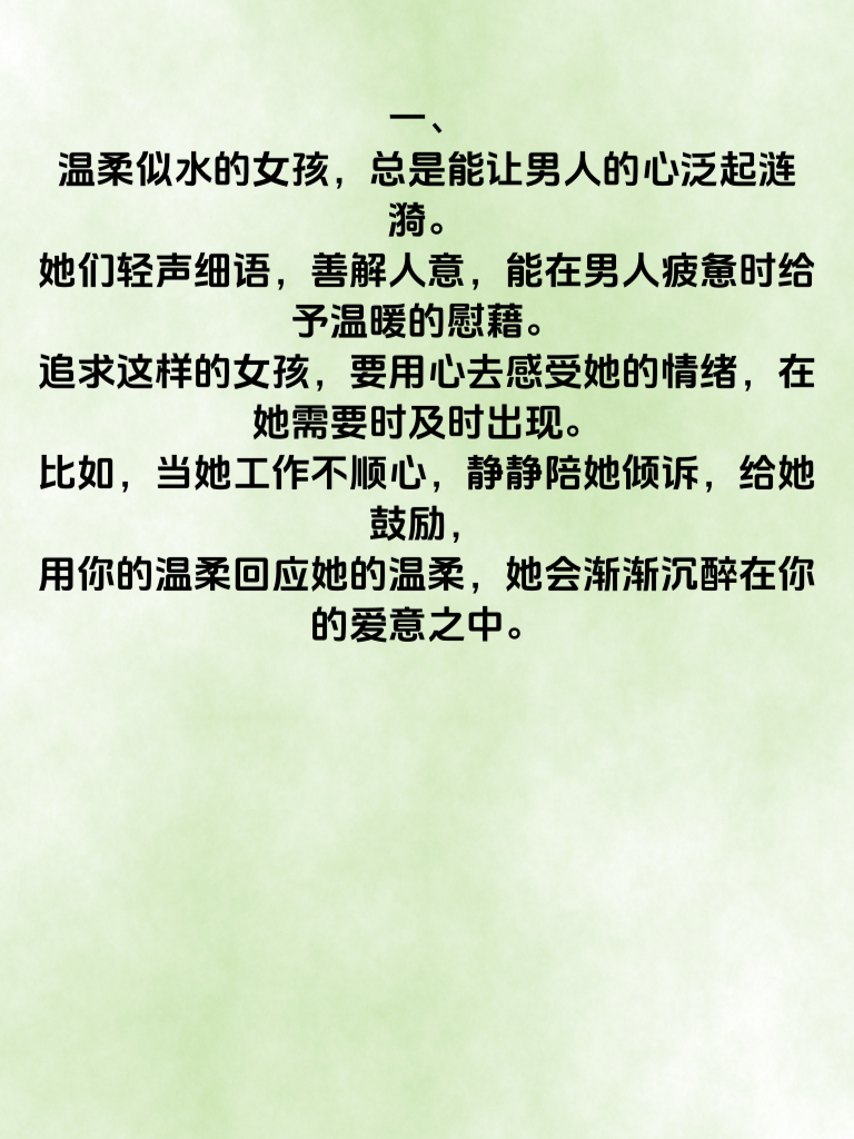 一、温柔似水的女孩,总是能让男人的心泛起涟漪。她们轻声细语,善解人意,能在男人疲惫时给予温暖的慰藉。追求这样的女孩,要用心去感受她的情绪,在她需要时及时出现。比如,当她工作不顺心,静静陪她倾诉,给她鼓励,用你的温柔回应她的温柔,她会渐渐沉醉在你的爱意之中。 二、独立自信的女孩,有着独特的魅力。她们有自己的追求和想法,不依赖他人。你若追求她,要欣赏她的独立,与她并肩前行。和她一起探讨梦想,支持她的决定。当她在事业上取得小成就,真诚为她喝彩。这种相互尊重与支持,会让她对你倾心,沉醉于你们共同营造的美好关系里。 三、热爱生活的女孩,眼中总是闪烁着光芒。她们对世间万物充满好奇与热情,能发现生活中的点滴美好。追求她时,不妨和她一起去探索未知,比如爬山看日出、品尝新美食。分享生活的喜怒哀乐,让她感受到你也是那个能和她一起把日子过得精彩纷呈的人,如此,她很容易就会沉醉在与你共度的时光里。