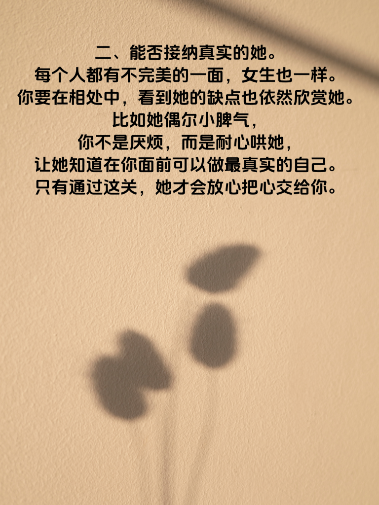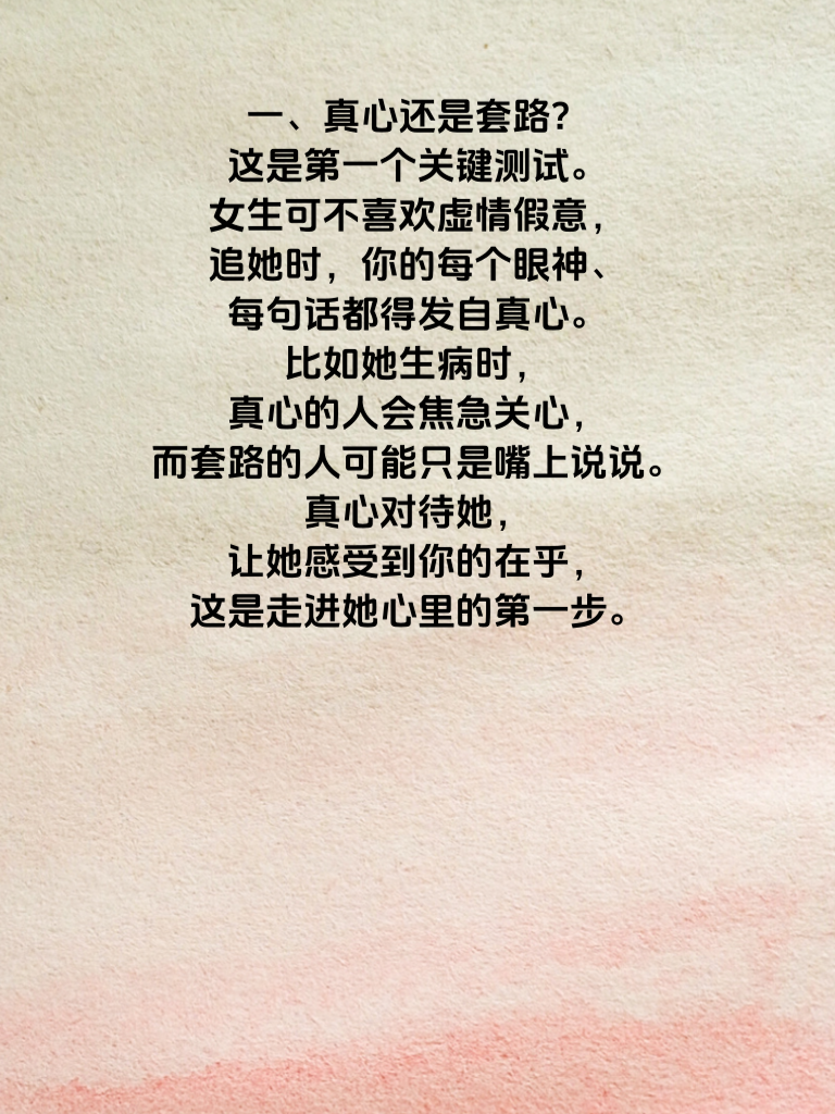 一、真心还是套路?这是第一个关键测试。女生可不喜欢虚情假意,追她时,你的每个眼神、每句话都得发自真心。比如她生病时,真心的人会焦急关心,而套路的人可能只是嘴上说说。真心对待她,让她感受到你的在乎,这是走进她心里的第一步。 二、能否接纳真实的她。每个人都有不完美的一面,女生也一样。你要在相处中,看到她的缺点也依然欣赏她。比如她偶尔小脾气,你不是厌烦,而是耐心哄她,让她知道在你面前可以做最真实的自己。只有通过这关,她才会放心把心交给你。 三、长期陪伴的决心。追女生不是一阵子的事,而是长久的陪伴。你要让她相信,未来的日子你都会在。比如计划好一起去看的电影,答应陪她度过的每个节日,都要一一兑现。用行动证明你的决心,她才会安心与你携手同行。通过这三个心理测试,你离成功追到心仪女生就不远啦。