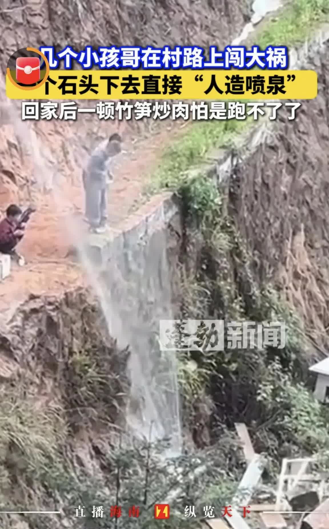这是一条山村的小路,三个10岁左右的小朋友,正在清理路障。 这条不宽的山路上,有几块看着像路沿石的石头,躺在了路中间,还有一些其他的杂物。 三个小朋友费了九牛二虎之力,推下了一块石头,又推下了第二块石头。 当第二块石头落下小山沟时,砸中了一个小腿粗的水管,霎间,水像喷泉一样喷了上来。 小朋友们看到这情景,吓得赶快跑了。 这条水管,看着像是从山下边引到山上的水管,这样子跑水,山上村庄估计要断水了。 要说这事也怨不得小孩子们,10来岁的孩子正处在调皮的年龄,谁在小时候没做过一两件出格的事情,说不定小朋友们本来是想做好事呢。 另外这水管工程儿做的也太粗糙了,最起码水管上面应该建有遮挡物,防止山石落下砸坏水管。 坏事其实也是好事,给以后的工程建设提了个醒,不能再这样马虎了。