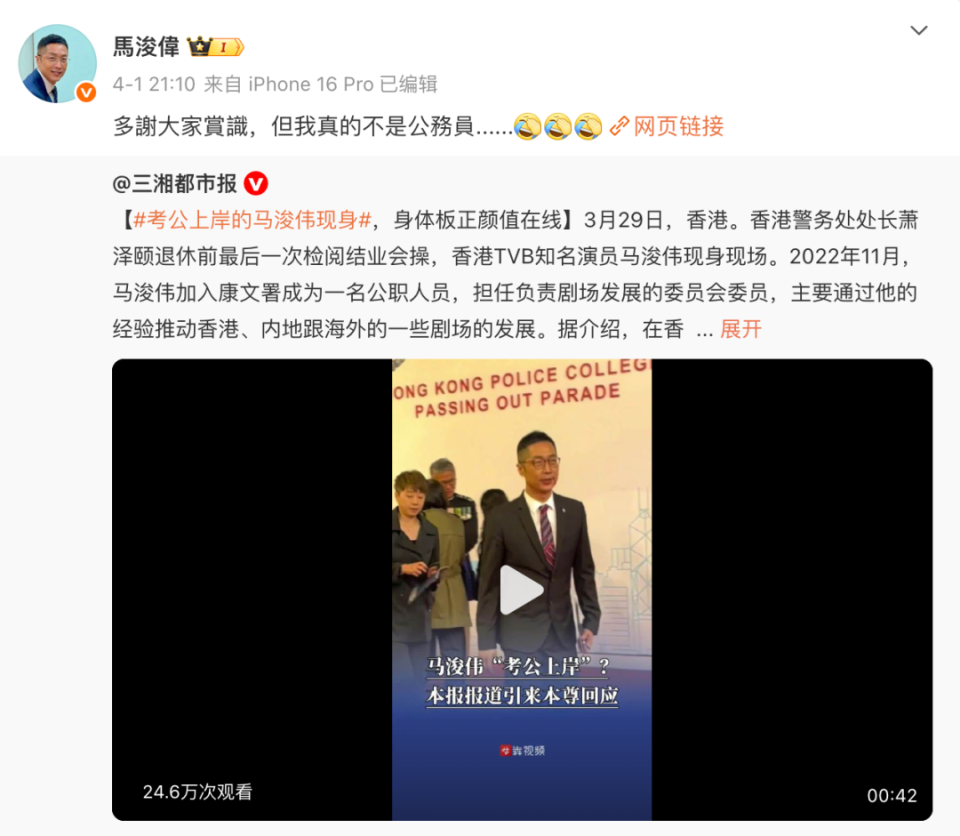 有媒体报道称,马浚伟“考公上岸”?他本人在微博最新回应称:“多谢大家赏识,但我真的不是公务员。”