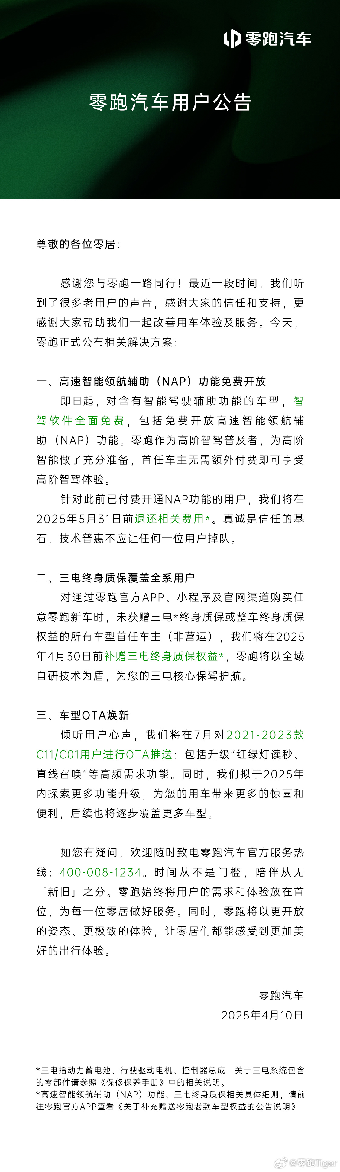 此外,零跑宣布三电终身质保覆盖全系用户,对通过零跑官方App、小程序及官网渠道购买任意零跑新车时,未获赠三电终身质保或整车终身质保权益的所有车型首任车主(非营运),官方将在2025年4月30日前补赠三电终身质保权益。