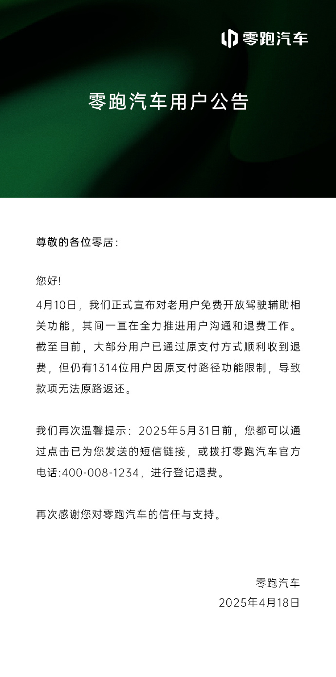 IT之家4月19日消息,零跑汽车昨晚发布公告称,4月10日,我们正式宣布对老用户免费开放驾驶辅助相关功能,其间一直在全力推进用户沟通和退费工作。截至目前,大部分用户已通过原支付方式顺利收到退费,但仍有1314位用户因原支付路径功能限制,导致款项无法原路返还。