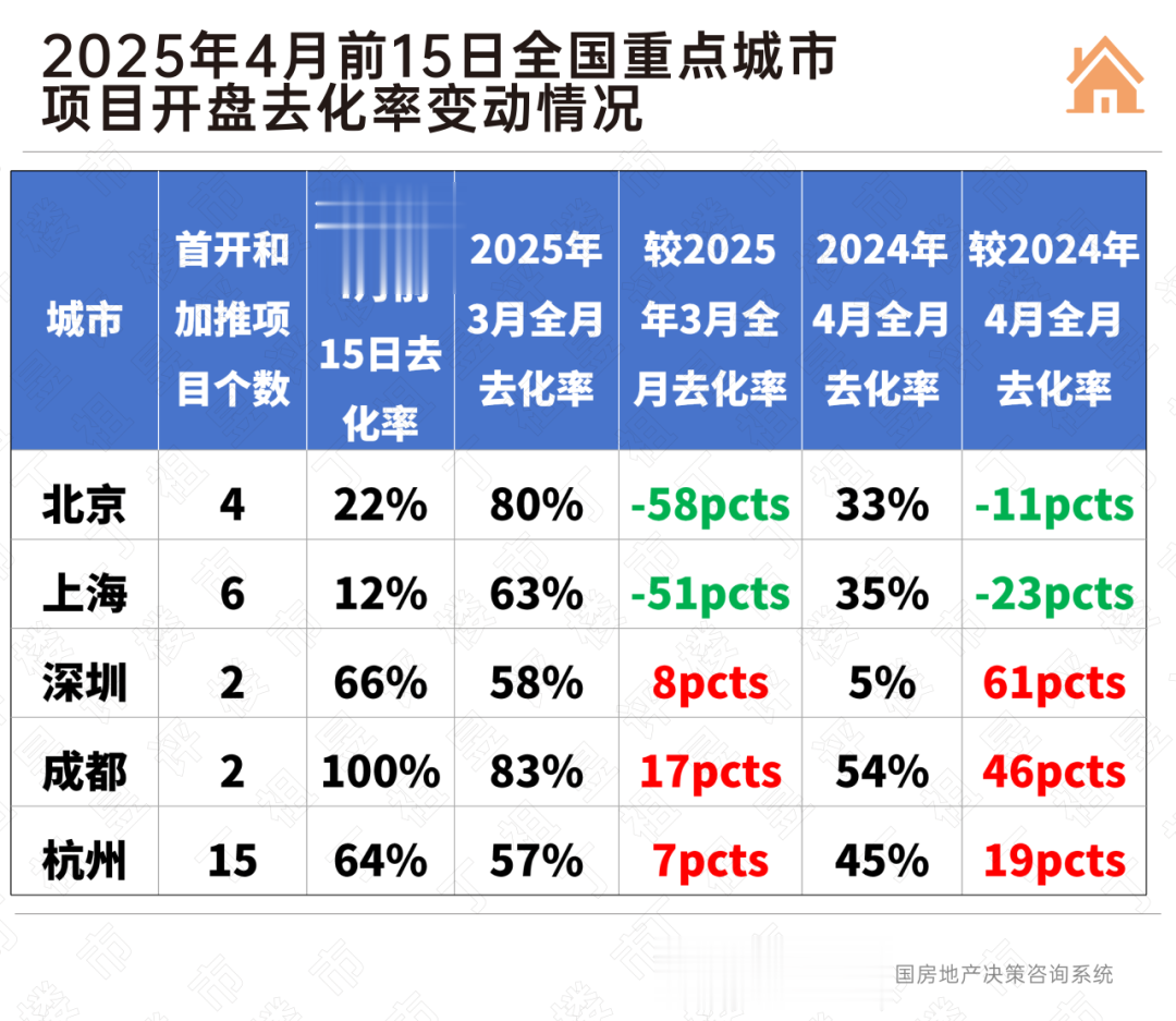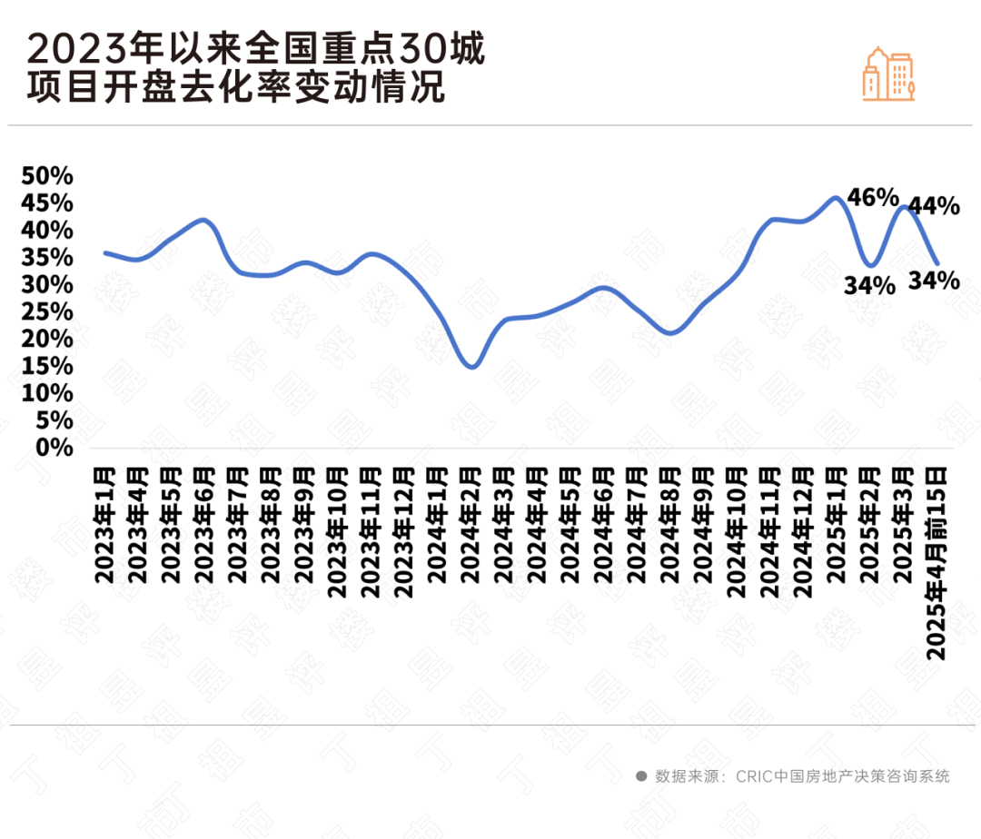 据CRIC监测数据,4月上半月重点30城项目开盘去化率为34%,与2025年2月全月持平,较2025年3月全月下降10个百分点,与2024年4月全月相比增长10个百分点。