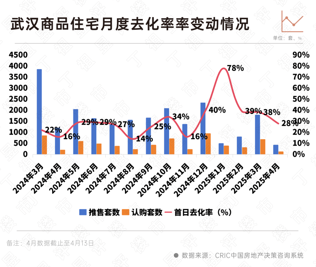 从项目开盘来看,4月上旬武汉项目平均去化率重回3成以内,为28%。事实上,2025年1月因推盘提质缩量去化率一度飙升至78%,2月以来便呈现出逐月回落行情,增长动能明显不足。