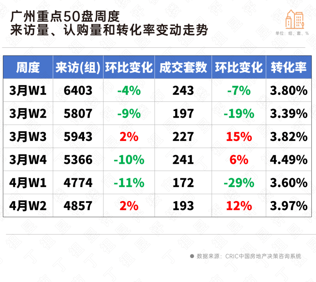 以广州为例,3月至今,重点监测50盘周度总来访量环比跌多涨少,客户转化率基本在4%左右低位波动。
