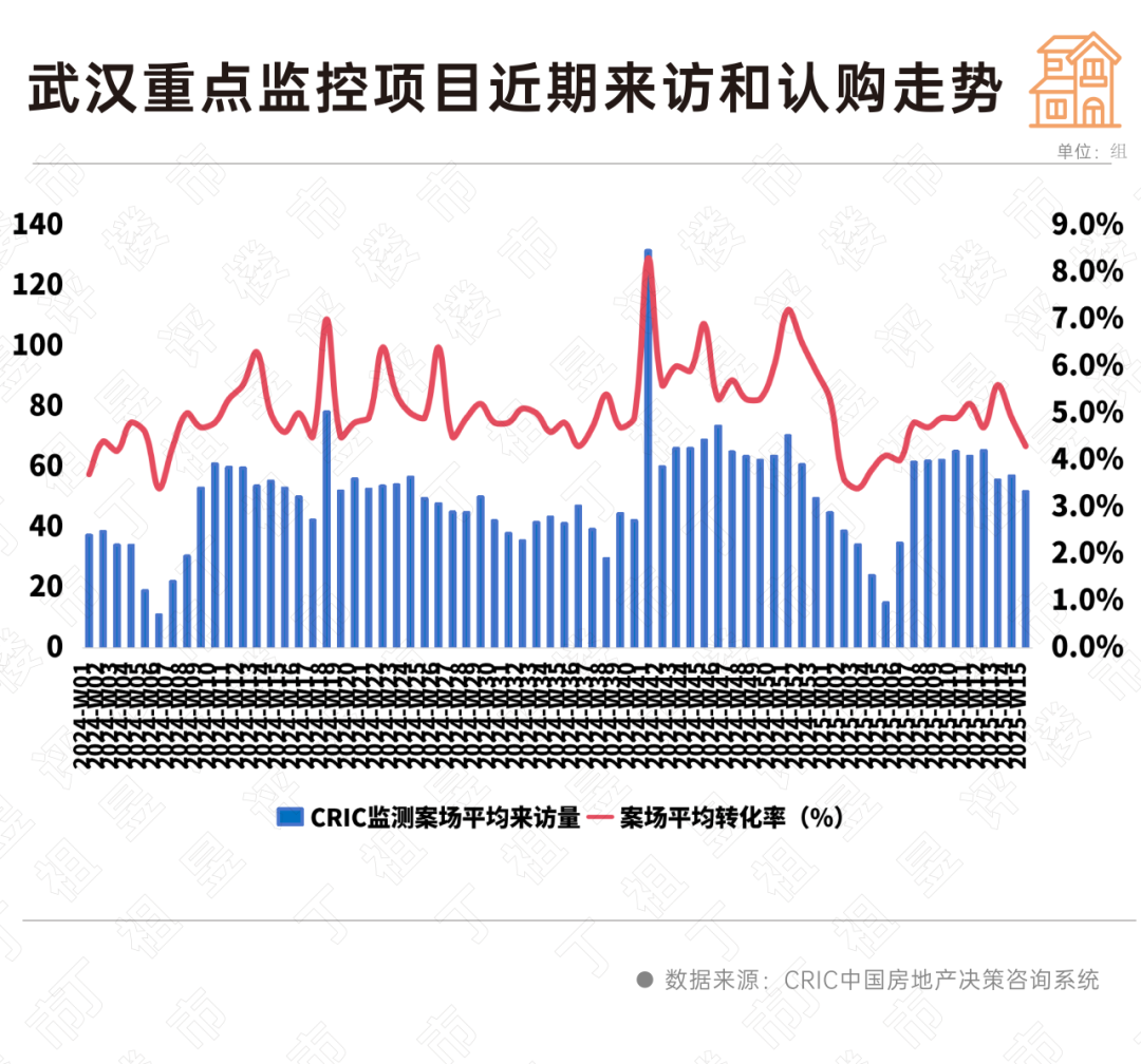 以武汉为例,4月以来项目来访、认购来稳步回落,受此影响,客户转化率高位回落:据CRIC监测重点项目显示,4月近2周单盘周均来访量均降至60组以下,单盘周均认购量逐周回落(14周2.8套,15周2.2套),不及去年同期。客户看房欲望稳中有降,客户转化率降至4.3%。