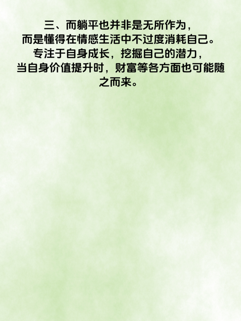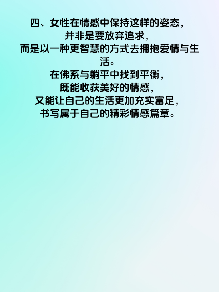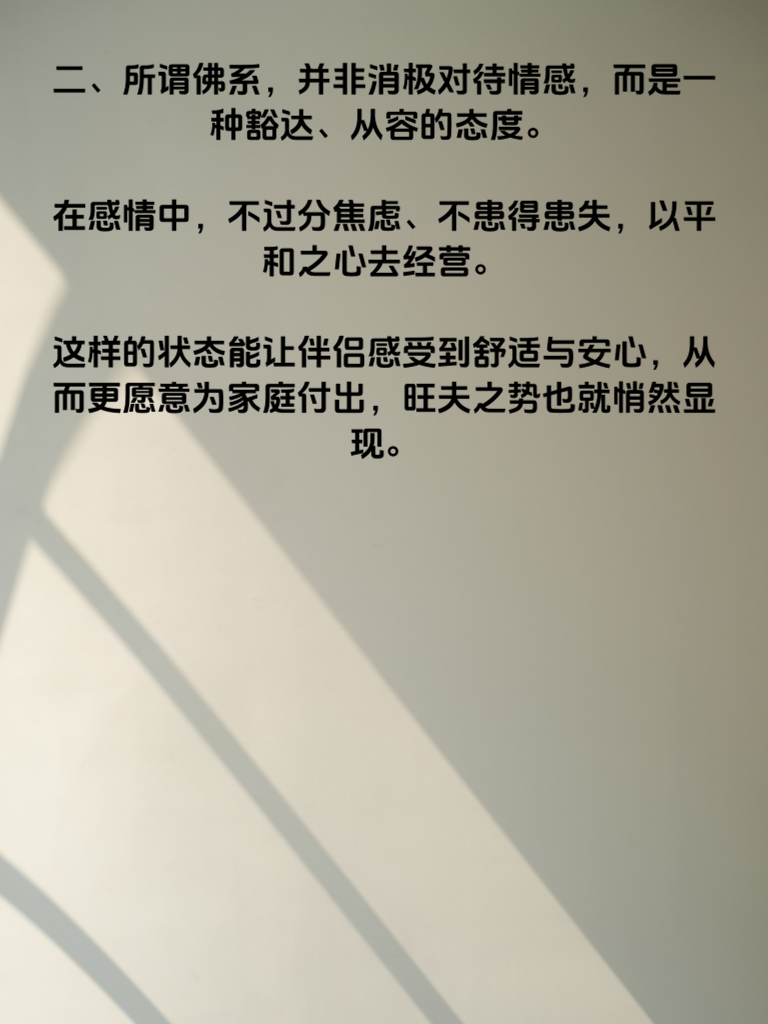 一、2025 年,对于女性来说,情感世界似乎有着别样的玄机。有一种说法是,越佛系越旺夫,越躺平越进账。 二、所谓佛系,并非消极对待情感,而是一种豁达、从容的态度。在感情中不过分焦虑、不患得患失,以平和之心去经营。这样的状态能让伴侣感受到舒适与安心,从而更愿意为家庭付出,旺夫之势也就悄然显现。 三、而躺平也并非是无所作为,而是懂得在情感生活中不过度消耗自己。专注于自身成长,挖掘自己的潜力,当自身价值提升时,财富等各方面也可能随之而来。 四、女性在情感中保持这样的姿态,并非是要放弃追求,而是以一种更智慧的方式去拥抱爱情与生活。在佛系与躺平中找到平衡,既能收获美好的情感,又能让自己的生活更加充实富足,书写属于自己的精彩情感篇章。