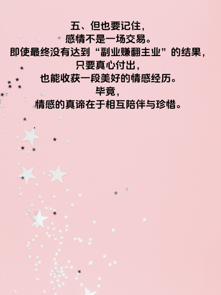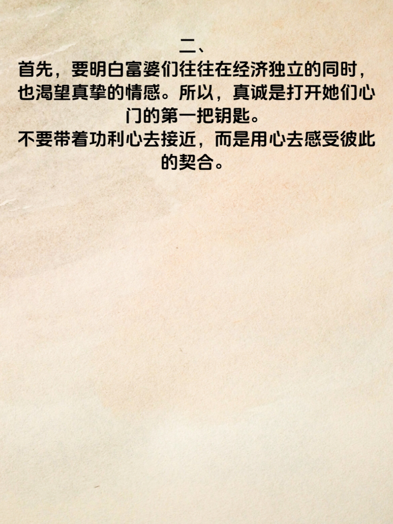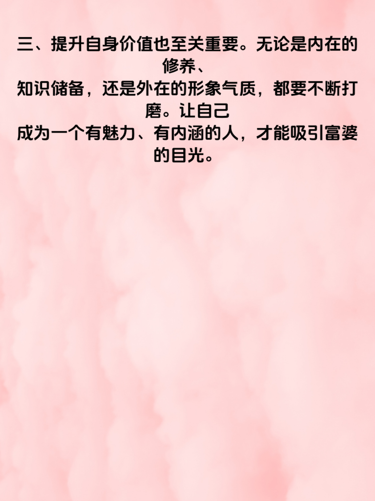 一、在情感的世界里,似乎总有些独特的故事在上演。就如“兔男 2025 年情感雷达:精准捕获富婆,副业赚翻主业”这个标题所引发的想象。其实,追求富婆并非是不切实际的幻想,但需要一些特别的技巧和对情感的敏锐洞察。 二、首先,要明白富婆们往往在经济独立的同时,也渴望真挚的情感。所以,真诚是打开她们心门的第一把钥匙。不要带着功利心去接近,而是用心去感受彼此的契合。 三、提升自身价值也至关重要。无论是内在的修养、知识储备,还是外在的形象气质,都要不断打磨。让自己成为一个有魅力、有内涵的人,才能吸引富婆的目光。 四、再者,建立共同兴趣爱好是拉近关系的有效途径。找到与她都感兴趣的领域,一起交流、互动,增进彼此的了解和感情。 五、但也要记住,感情不是一场交易。即使最终没有达到“副业赚翻主业”的结果,只要真心付出,也能收获一段美好的情感经历。毕竟,情感的真谛在于相互陪伴与珍惜。