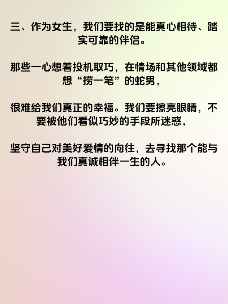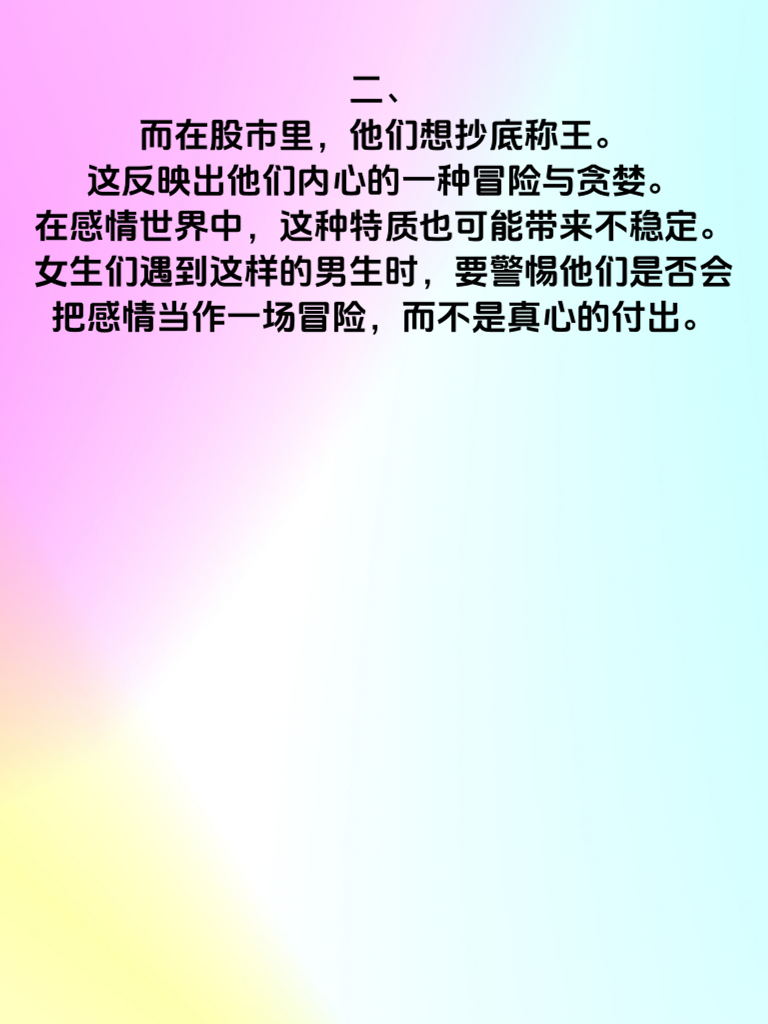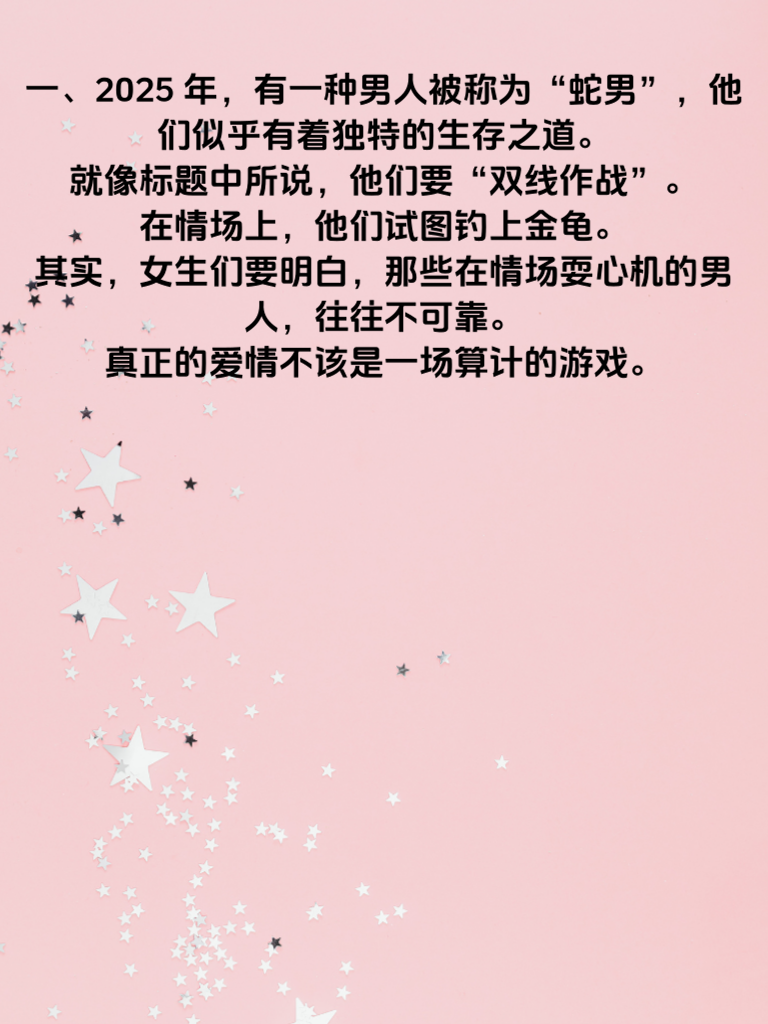 一、2025 年,有一种男人被称为“蛇男”,他们似乎有着独特的生存之道。就像标题中所说,他们要“双线作战”。在情场上,他们试图钓上金龟。其实,女生们要明白,那些在情场耍心机的男人,往往不可靠。真正的爱情不该是一场算计的游戏。 二、而在股市里,他们想抄底称王。这反映出他们内心的一种冒险与贪婪。在感情世界中,这种特质也可能带来不稳定。女生们遇到这样的男生时,要警惕他们是否会把感情当作一场冒险,而不是真心的付出。 三、作为女生,我们要找的是能真心相待、踏实可靠的伴侣。那些一心想着投机取巧,在情场和其他领域都想“捞一笔”的蛇男,很难给我们真正的幸福。我们要擦亮眼睛,不要被他们看似巧妙的手段所迷惑,坚守自己对美好爱情的向往,去寻找那个能与我们真诚相伴一生的人。