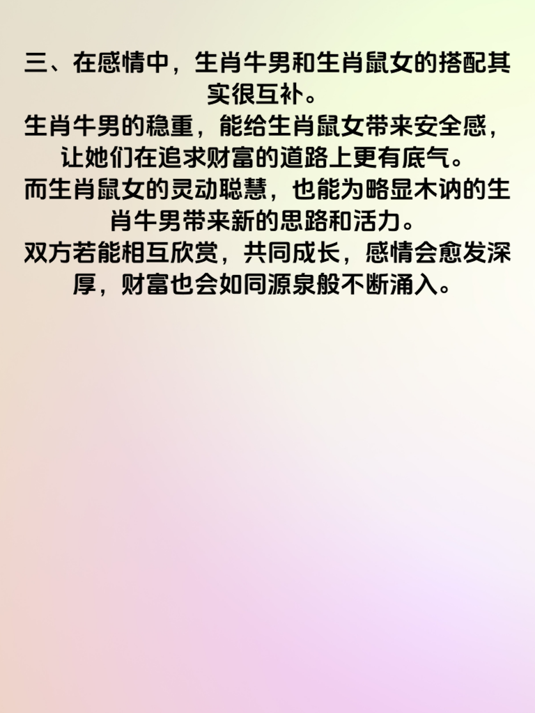一、2025 年,对于生肖牛男来说,情路似乎有着别样的顺畅。生肖牛男性格稳重踏实,在这一年里,他们对待感情的真诚更容易被看见。他们会用实际行动去关心呵护心仪的女生,比如记住对方的喜好,在特殊日子送上贴心礼物。这种细腻的关怀,能让生肖鼠女感受到深深的爱意。 二、而生肖鼠女在 2025 年有着财库大开的迹象。她们本就聪明伶俐,善于把握机会。在这一年,她们会凭借敏锐的洞察力,在职场或生活中发现不少赚钱的门道。比如可能会抓住一些新兴行业的机遇,或者通过投资理财获得收益。当她们经济独立且富足时,自身魅力也会大大提升。 三、在感情中,生肖牛男和生肖鼠女的搭配其实很互补。生肖牛男的稳重能给生肖鼠女带来安全感,让她们在追求财富的道路上更有底气。而生肖鼠女的灵动聪慧,也能为略显木讷的生肖牛男带来新的思路和活力。双方若能相互欣赏,共同成长,感情会愈发深厚,财富也会如同源泉般不断涌入。
