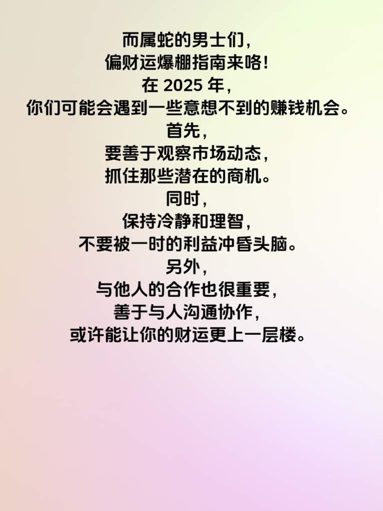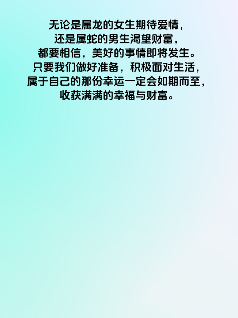 嘿,属龙的姐妹们注意啦!2025 年可是你们正缘降临的好时机哦!这一年,爱情或许会在不经意间悄然来到你身边。保持积极乐观的心态,多参加一些社交活动,扩大自己的社交圈,说不定那个对的人就在某个转角等着你呢。 而属蛇的男士们,偏财运爆棚指南来咯!在 2025 年,你们可能会遇到一些意想不到的赚钱机会。首先,要善于观察市场动态,抓住那些潜在的商机。同时,保持冷静和理智,不要被一时的利益冲昏头脑。另外,与他人的合作也很重要,善于与人沟通协作,或许能让你的财运更上一层楼。 无论是属龙的女生期待爱情,还是属蛇的男生渴望财富,都要相信,美好的事情即将发生。只要我们做好准备,积极面对生活,属于自己的那份幸运一定会如期而至,收获满满的幸福与财富。