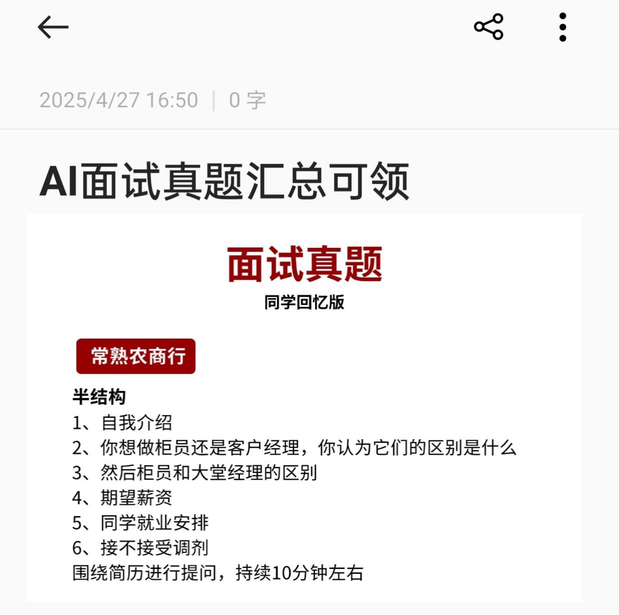 江苏农商行面试已经通知! 江苏农商行节奏非常快!常熟农商行已经发AI面试通知不要着急!信息为群发!只要投递常熟农商银行的同学都会收到此条信息(包括网申未通过的同学)但是江苏农商行秉持“笔试+面试”成绩择优录取规则,收到通知按照要求参加即可!务必好好表现! 江苏农商行 江苏农商行春招 江苏农商行面试