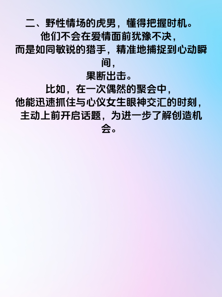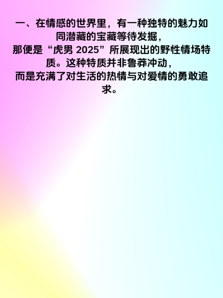 一、在情感的世界里,有一种独特的魅力如同潜藏的宝藏等待发掘,那便是“虎男2025”所展现出的野性情场特质。这种特质并非鲁莽冲动,而是充满了对生活的热情与对爱情的勇敢追求。 二、野性情场的虎男,懂得把握时机。他们不会在爱情面前犹豫不决,而是如同敏锐的猎手,精准地捕捉到心动瞬间,果断出击。比如,在一次偶然的聚会中,他能迅速抓住与心仪女生眼神交汇的时刻,主动上前开启话题,为进一步了解创造机会。 三、他们还暗藏财机破迷局。这里的财机并非单纯指物质财富,而是一种对生活、对情感的经营智慧。他们善于发现生活中的美好,并巧妙地与对方分享,为感情增添色彩。在面对感情中的困难与迷茫时,他们能冷静分析,用独特的视角和方法化解危机,让感情之路更加顺畅。 四、对于追求女生的男生们来说,借鉴“虎男2025”的特质,学会勇敢表达、善于把握时机、用智慧经营感情,定能在情场中收获属于自己的幸福,书写浪漫而美好的爱情篇章。