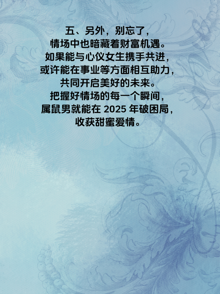 一、2025 年,对于属鼠的男生来说,情场或许暗藏玄机。要想在情场中慧眼独具,首先得学会洞察心仪女生的心思。每个女生都有自己独特的喜好和情感需求,只有用心去观察,才能找到打开她心门的钥匙。 二、在追求的过程中,不能盲目冲动,而要有策略地行动。比如,了解她的兴趣爱好,投其所好地展开话题。一场恰到好处的电影约会,一次契合她爱好的户外活动,都能让你们的相处更加愉快,拉近彼此的距离。 三、同时,2025 年的情场也充满了各种诱惑和挑战。属鼠男要保持清醒的头脑,不被外界因素干扰。坚定自己对感情的初心,专注于与她的互动,用真诚去打动她。 四、而且,情场如战场,也需要有一定的应变能力。当遇到困难或分歧时,不要慌张,要冷静分析,以平和的心态去沟通解决。巧妙地化解矛盾,才能让感情之路更加顺畅。 五、另外,别忘了情场中也暗藏着财富机遇。如果能与心仪女生携手共进,或许能在事业等方面相互助力,共同开启美好的未来。把握好情场的每一个瞬间,属鼠男就能在 2025 年破困局,收获甜蜜爱情。