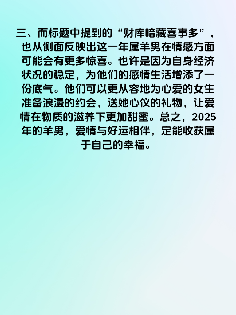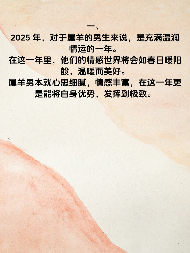 一、2025 年,对于属羊的男生来说,是充满温润情运的一年。在这一年里,他们的情感世界将会如春日暖阳般温暖而美好。属羊男本就心思细腻,情感丰富,在这一年更是能将自身优势发挥到极致。 二、温润的情运,意味着他们在追求爱情的道路上会更加顺遂。他们懂得倾听女生的心声,用温柔的话语给予安慰和鼓励,让女生在他们身边感受到无尽的关怀。比如,当女生遇到烦恼时,属羊男会耐心地陪伴,轻声细语地开导,这种贴心的举动很容易走进女生的心里。 三、而标题中提到的“财库暗藏喜事多”,也从侧面反映出这一年属羊男在情感方面可能会有更多惊喜。也许是因为自身经济状况的稳定,为他们的感情生活增添了一份底气。他们可以更从容地为心爱的女生准备浪漫的约会,送她心仪的礼物,让爱情在物质的滋养下更加甜蜜。总之,2025 年的羊男,爱情与好运相伴,定能收获属于自己的幸福。