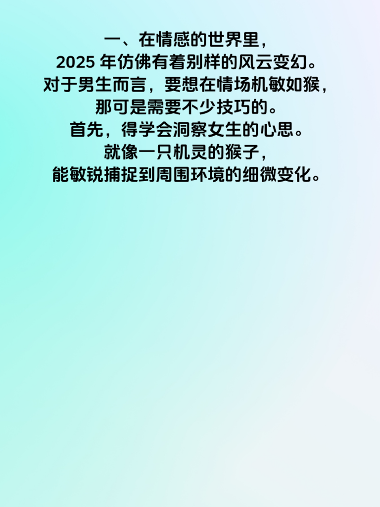 一、在情感的世界里,2025 年仿佛有着别样的风云变幻。对于男生而言,要想在情场机敏如猴,那可是需要不少技巧的。首先,得学会洞察女生的心思。就像一只机灵的猴子,能敏锐捕捉到周围环境的细微变化。 二、了解她的喜好和情绪起伏,在恰当的时候给予关心和回应。这可不是一件容易的事,但只要用心去观察,总能发现那些隐藏在细节里的信号。 三、同时,追求女生不能只靠花言巧语,还得有实际行动。努力提升自己的经济实力,让财路生风,为未来的生活打下坚实基础。这不仅能给她安全感,也是展现自身魅力的重要方面。 四、面对追求过程中的重重迷障,比如她的犹豫、她的小脾气,都要像猴子一样灵活应对。用耐心和智慧去化解,一步步走进她的内心世界,开启一段美好的情感旅程。