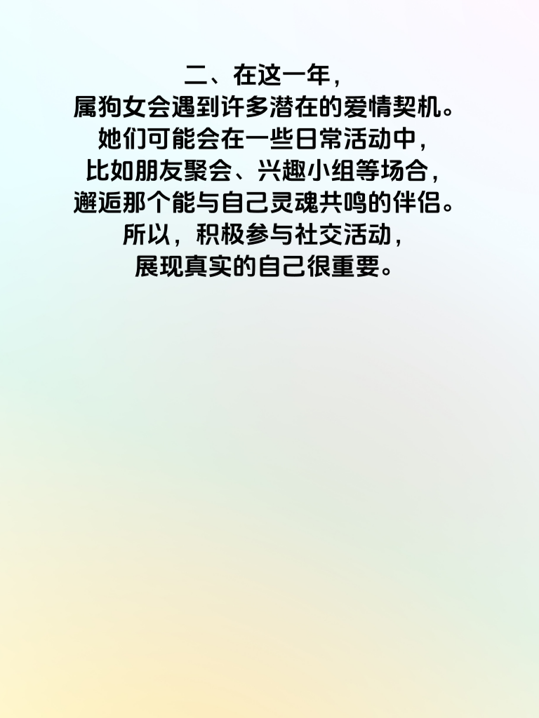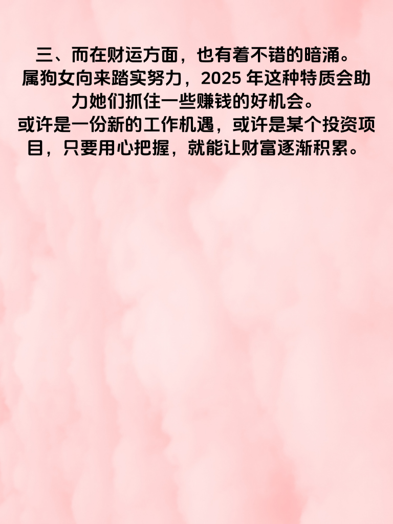 一、对于属狗的女生来说,2025年是充满机遇与美好的一年。在情感方面,她们将忠守情运,收获满满的幸福。只要秉持真诚与专一,就能吸引到那个对的人。 二、在这一年,属狗女会遇到许多潜在的爱情契机。她们可能会在一些日常活动中,比如朋友聚会、兴趣小组等场合,邂逅那个能与自己灵魂共鸣的伴侣。所以,积极参与社交活动,展现真实的自己很重要。 三、而在财运方面,也有着不错的暗涌。属狗女向来踏实努力,2025年这种特质会助力她们抓住一些赚钱的好机会。或许是一份新的工作机遇,或许是某个投资项目,只要用心把握,就能让财富逐渐积累。 四、福满门更是这一年的写照。属狗女善良的内心会吸引诸多福气围绕。家庭中,她们会与亲人关系更加融洽,享受亲情的温暖。爱情里,甜蜜相伴,幸福满满。事业上,也会有贵人相助,一切都朝着美好的方向发展。只要保持乐观积极的心态,属狗女在2025年必将收获属于自己的精彩人生。
