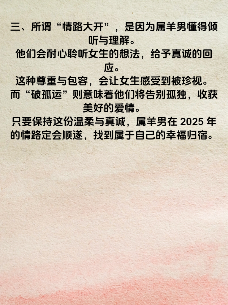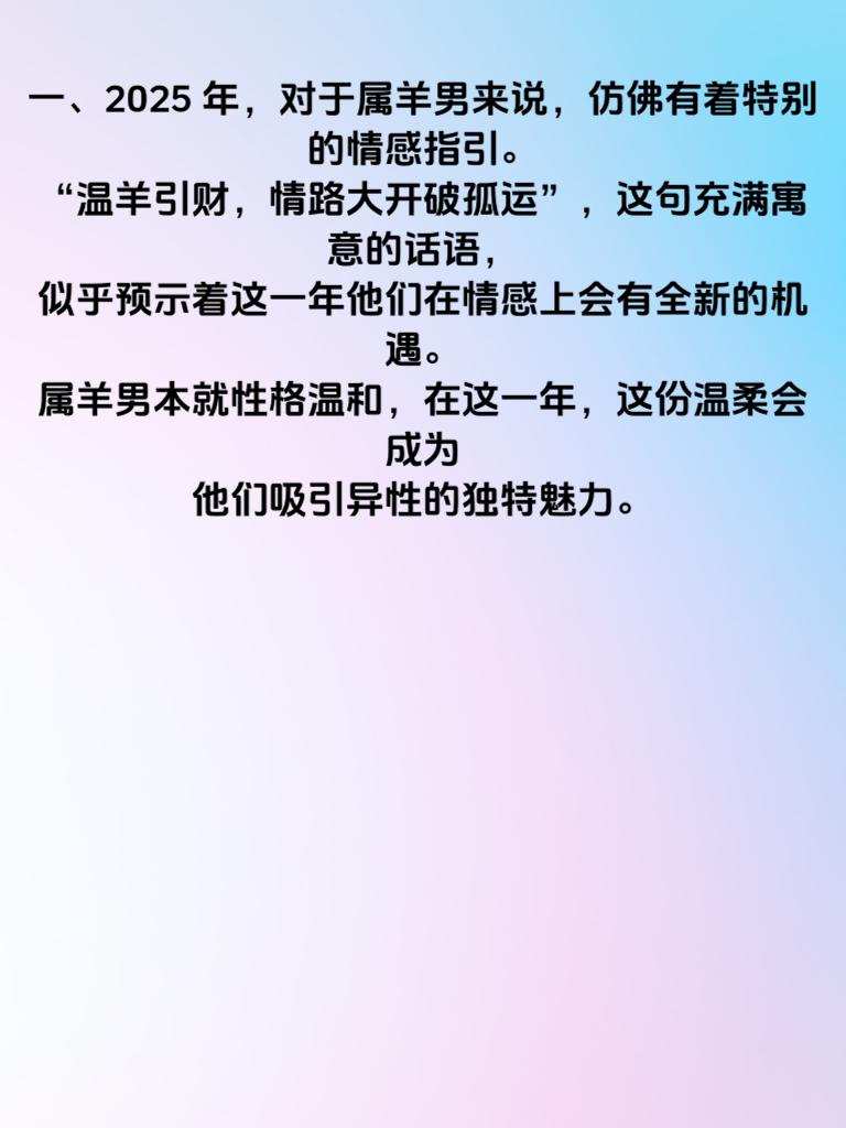 一、2025年,对于属羊男来说,仿佛有着特别的情感指引。“温羊引财,情路大开破孤运”,这句充满寓意的话语,似乎预示着这一年他们在情感上会有全新的机遇。属羊男本就性格温和,在这一年,这份温柔会成为他们吸引异性的独特魅力。 二、他们会以更加细腻的心思去感受对方的需求,用温暖的关怀让身边的人如沐春风。在追求心仪女生的道路上,凭借这份温和,更容易拉近彼此的距离。不再莽撞,而是用恰到好处的方式走进女生的内心世界。 三、所谓“情路大开”,是因为属羊男懂得倾听与理解。他们会耐心聆听女生的想法,给予真诚的回应。这种尊重与包容,会让女生感受到被珍视。而“破孤运”则意味着他们将告别孤独,收获美好的爱情。只要保持这份温柔与真诚,属羊男在2025年的情路定会顺遂,找到属于自己的幸福归宿。