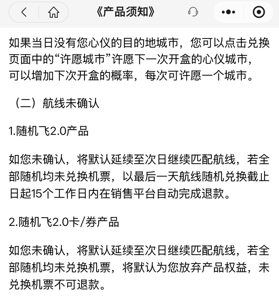记者注意到,这张截图截取的《随机飞2.0产品旅客须知》“航线未确认”条目。根据该条目,“随机飞2.0产品”若全部随机均未兑换机票,以最后一天航线随机兑换截止日起15个工作日内在销售平台自动完成退款。“随机飞2.0卡/券产品”若全部随机均未兑换机票,将默认放弃产品权益,未兑换机票不可退款。