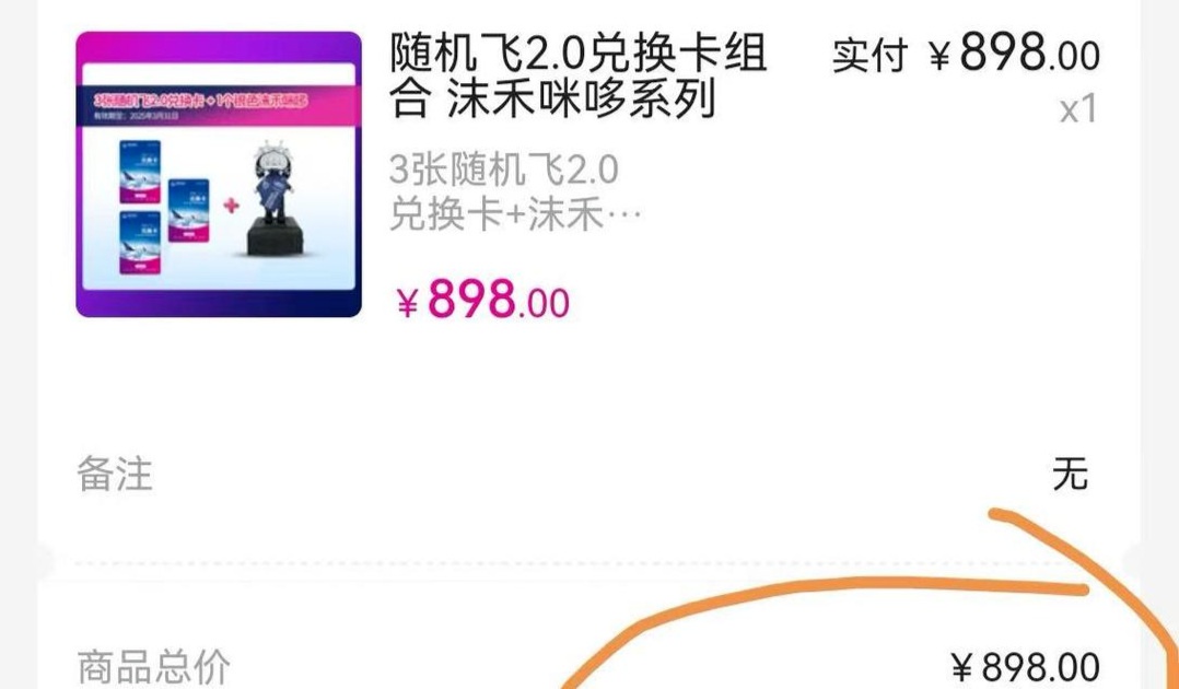 张女士出示的购买记录显示,2024年10月29日,她购买了898元的“随机飞2.0兑换卡组合沫禾咪哆系列”(“随机飞2.0卡/券产品”的一种)。张女士告诉红星新闻记者,她是通过小程序下单的,其中包含3张“随机飞2.0兑换卡”(实体卡)和一个纪念摆件。