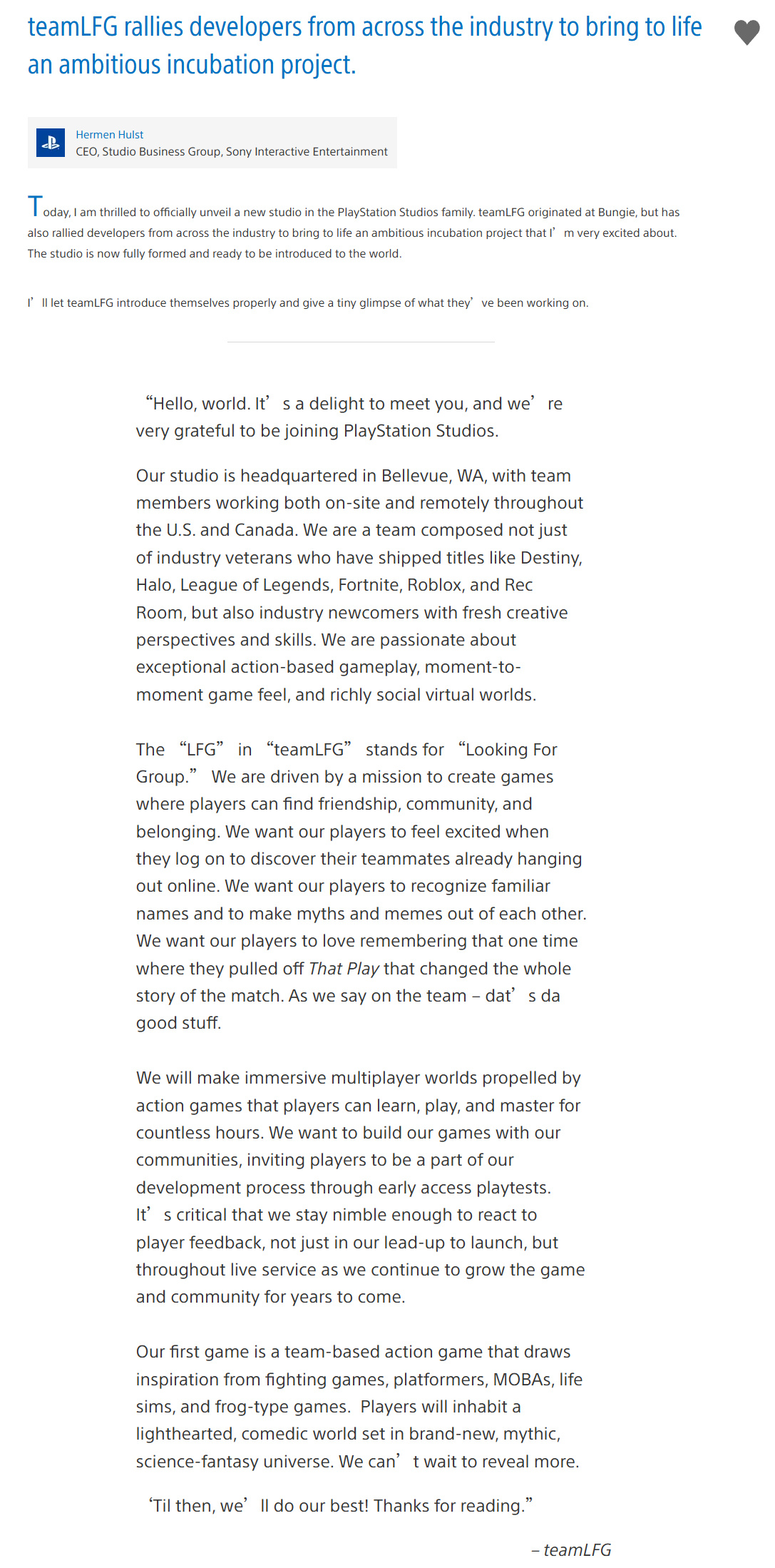 直播吧05月07日讯索尼PS官方今日宣布,正式成立全新第一方工作室teamLFG,总部位于华盛顿。该工作室最初来自Bungie,但也汇聚了来自整个行业的开发者,团队成员参与过《命运》《光环》《英雄联盟》《堡垒之夜》等作品的开发,会在美国和加拿大各地进行现场和远程办公。