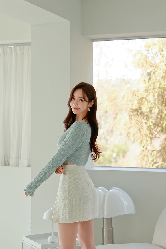 孙允珠:浅绿针织衫搭配米色短裙,温柔又清新,V领设计显锁骨