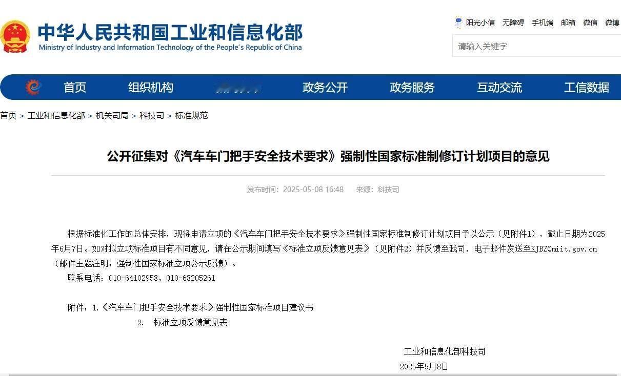 隐藏式门把手,终于要“被规范”了? 最近刷到一则不大不小的消息——工信部挂出了一个公示,说是要就《汽车车门门把手安全技术要求》制定强制性国家标准,并开始面向社会公开征求意见。截止时间是2025年6月7日,看得出这事并不是“说说而已”,是真要落地的节奏。 这么一说,你可能已经猜到了,这波针对的核心,其实就是这两年新能源车里特别流行的隐藏式门把手。这玩意儿,讲真,设计感拉满,科技氛围也到位,很多人第一眼看过去确实会觉得“高端”。但好不好用、安不安全,就是另一回事了。 不少车主吐槽过,冬天门把手被冻住打不开,或者电控系统抽风,导致临时打不开车门。更严重的,有人担心如果哪天出事了,比如落水、起火,那这门把手还能不能及时打开,谁也不敢打包票。于是,这种“酷炫设计”背后的安全问题,现在终于被官方盯上了。 而这一次要定的是“强制标准”,也就是说不是你愿不愿意的问题,而是你造车就得按照这个来。未来那些一味追求造型、为了风阻系数牺牲实用性的设计,可能就得重新考虑了。 所以,这对行业来说也算一剂“清醒剂”吧。潮流归潮流,但车毕竟是用来开的,不是用来凹造型的。门把手这种看似不起眼的零件,关键时刻可是性命攸关。 如果你最近正打算买新能源车,或者已经有了隐藏式门把手车型,不妨多关注下这事后续怎么发展。安全这事,真不是小题大做。