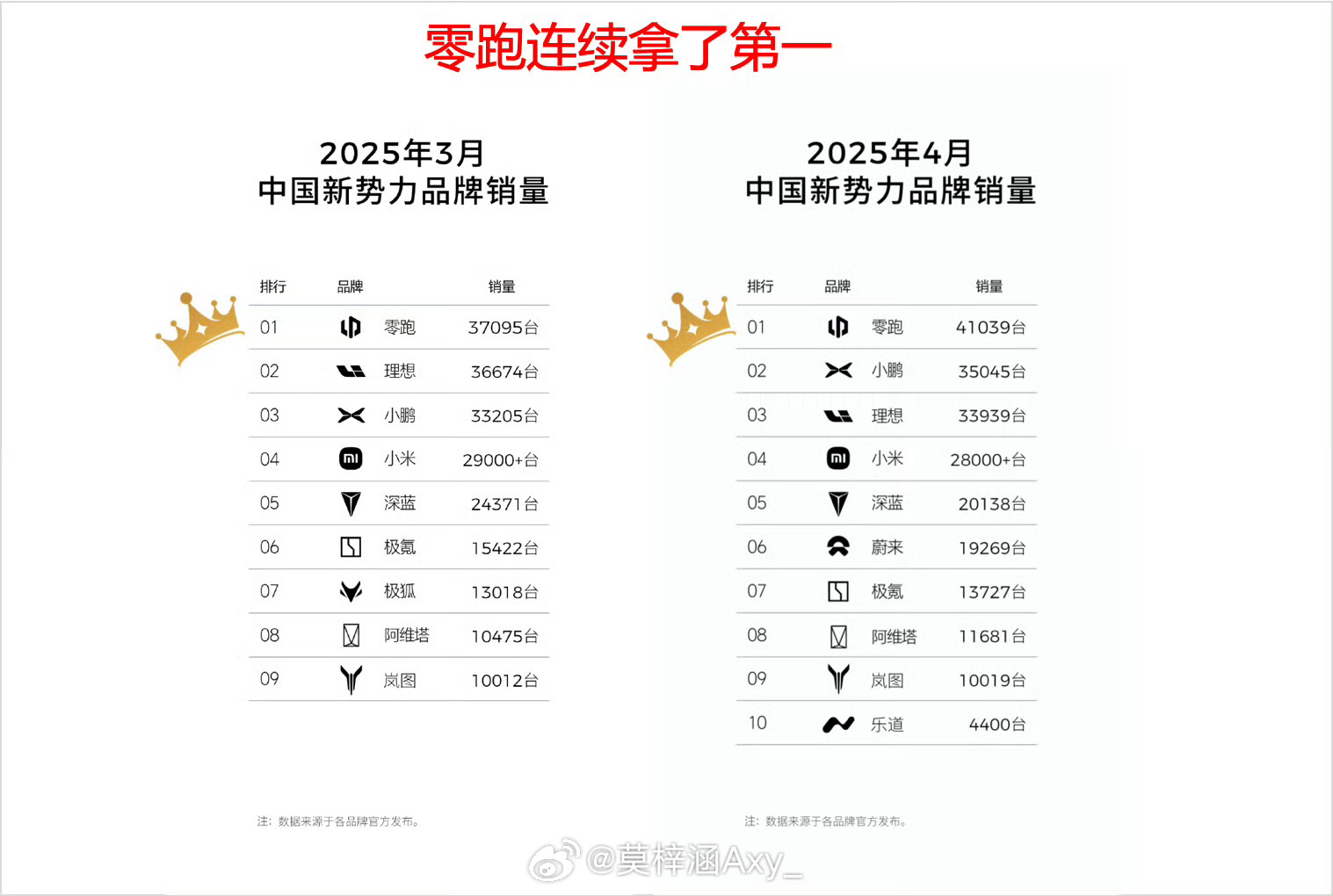 零跑新势力月销量连续第一3月4月连续登顶月度销量冠军,4月月销达41,039台,成为新势力中唯一销量突破4万的品牌,周榜也稳居第一。同比增长173%,环比增长约10%,稳居新势力榜首,也是新势力中唯一破4万品牌!爆款车型C11、C10与B系列的市场热捧,叠加海外市场的强劲增长,形成双轮驱动格局,其“品价比”战略正加速市场占有率提升,零跑时刻已然到来!汽场全开