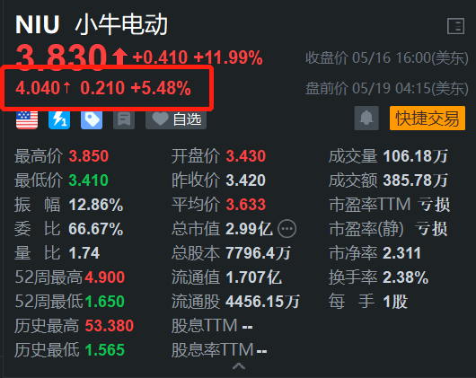 中国电动滑板车公司小牛电动(NIU.US)盘前涨5.5%。消息上,小牛电动公布2025年第一季度未经审计的财务业绩:第一季度营业收入为68200万,同比增长35.1%;第一季度净亏损为3880万,相较于上年同期的净亏损人民币5480万。第二季度营业收入展望为-141100万。