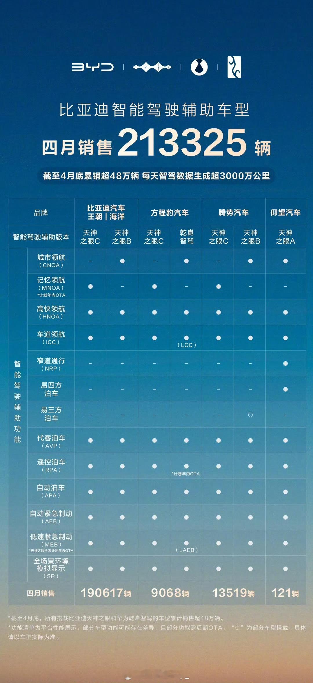 比亚迪4月领跑智驾辅助车型销量榜比亚迪在2025年4月的智能驾驶辅助车型销量表现突出,以单月21.33万辆智驾车型销量、累计超48万辆的成绩稳居行业榜首,智驾车型渗透率达71%。这是什么概念?平均每卖出10台智能汽车,就有7台贴着BYD的标!这一成绩背后体现了其战略布局、技术投入和市场认可度的多重优势。