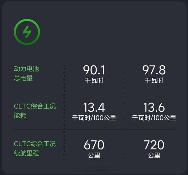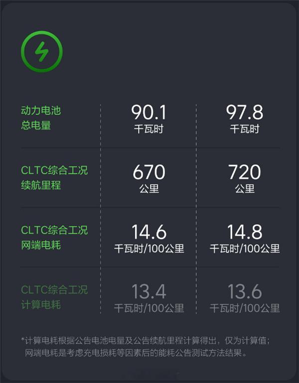 搭载90.1kWh电池的理想i8,CLTC综合工况网端电耗是14.6kWh/100km;搭载97.8kWh电池的理想i8,CLTC综合工况网端电耗是14.8kWh/100km。