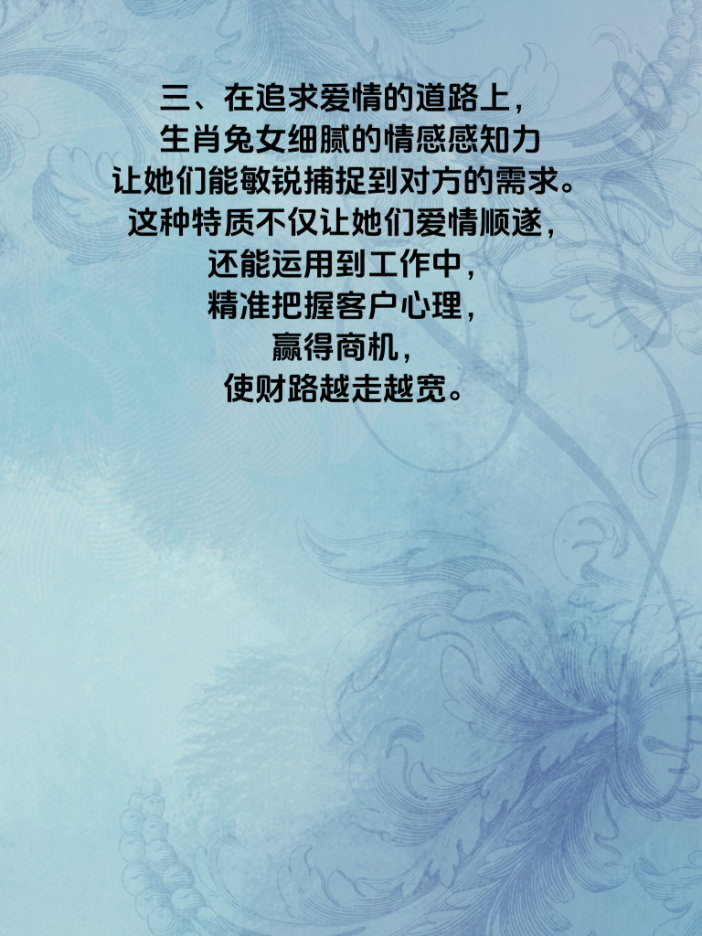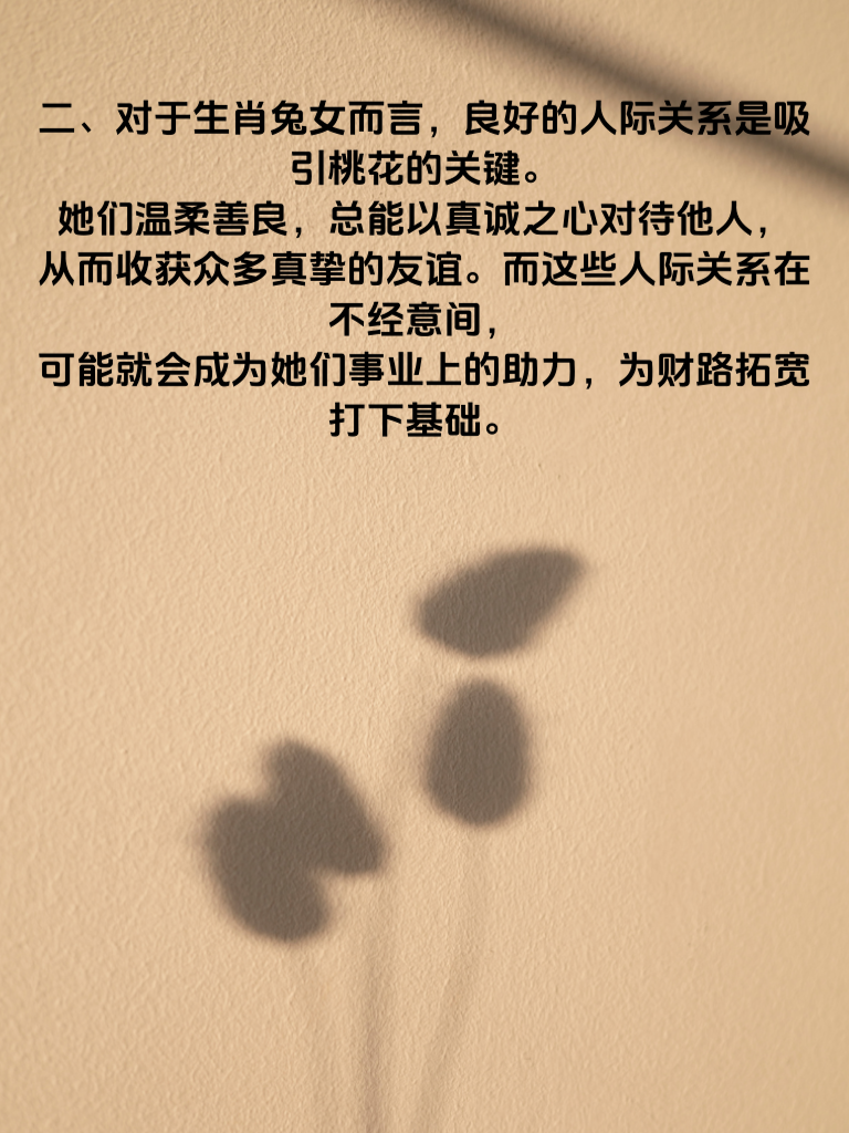 一、生肖兔女,宛如灵动的精灵,在情感与生活的舞台上散发着独特魅力。当她们的桃运旺盛之时,仿佛命运的齿轮开始朝着财富的方向转动,财路也随之渐渐开启。 二、对于生肖兔女而言,良好的人际关系是吸引桃花的关键。她们温柔善良,总能以真诚之心对待他人,从而收获众多真挚的友谊。而这些人际关系在不经意间,可能就会成为她们事业上的助力,为财路拓宽打下基础。 三、在追求爱情的道路上,生肖兔女细腻的情感感知力让她们能敏锐捕捉到对方的需求。这种特质不仅让她们爱情顺遂,还能运用到工作中,精准把握客户心理,赢得商机,使财路越走越宽。 四、她们乐观积极的心态也是桃运与财路双旺的秘诀。即便遇到困难,也能微笑面对,这份豁达吸引着身边的人,同时也为自己创造了更多机会,让财富不断汇聚。所以,生肖兔女们,尽情绽放你们的魅力,让桃运与财路一同灿烂吧。